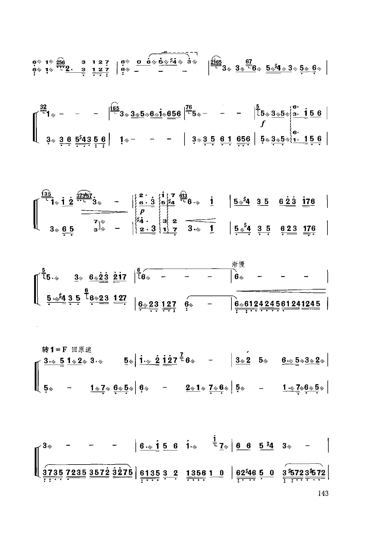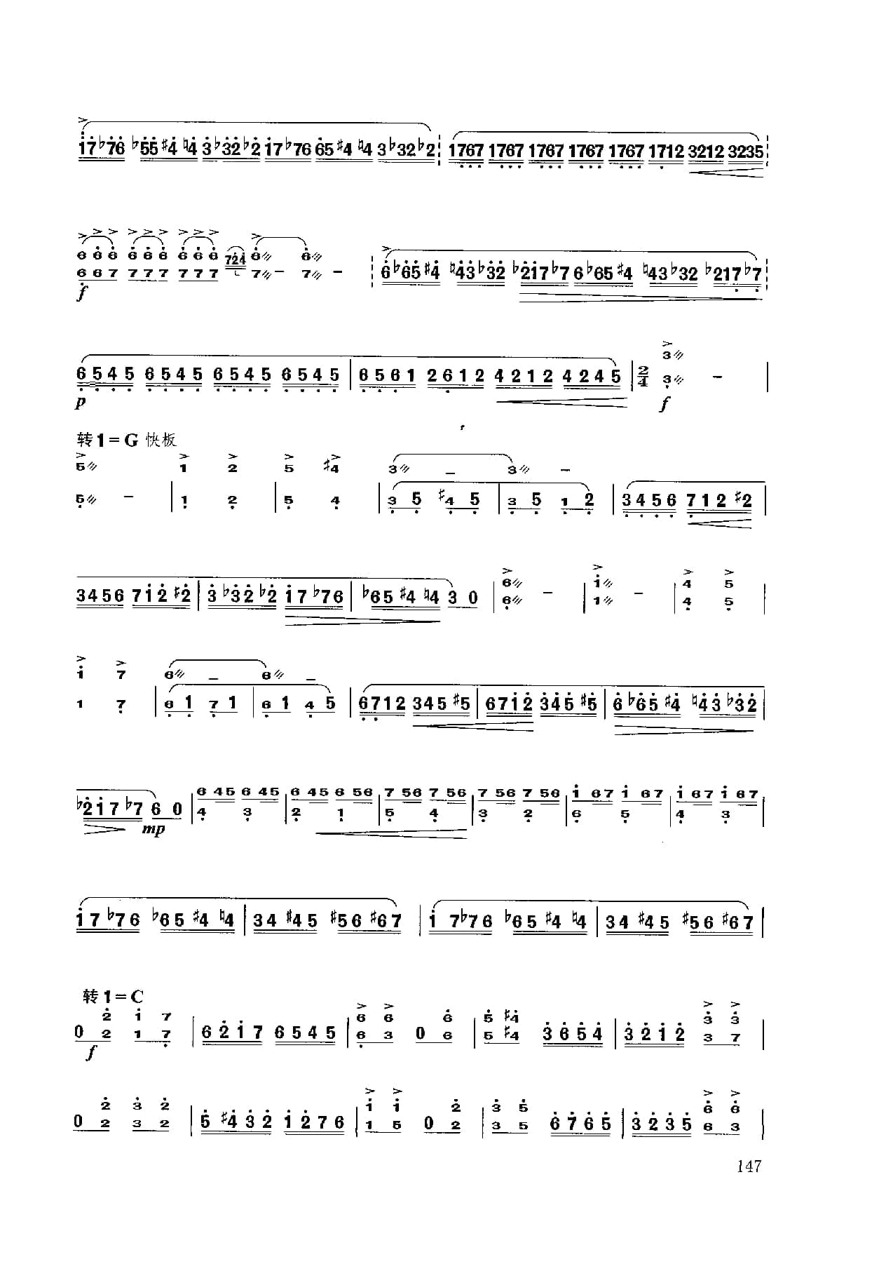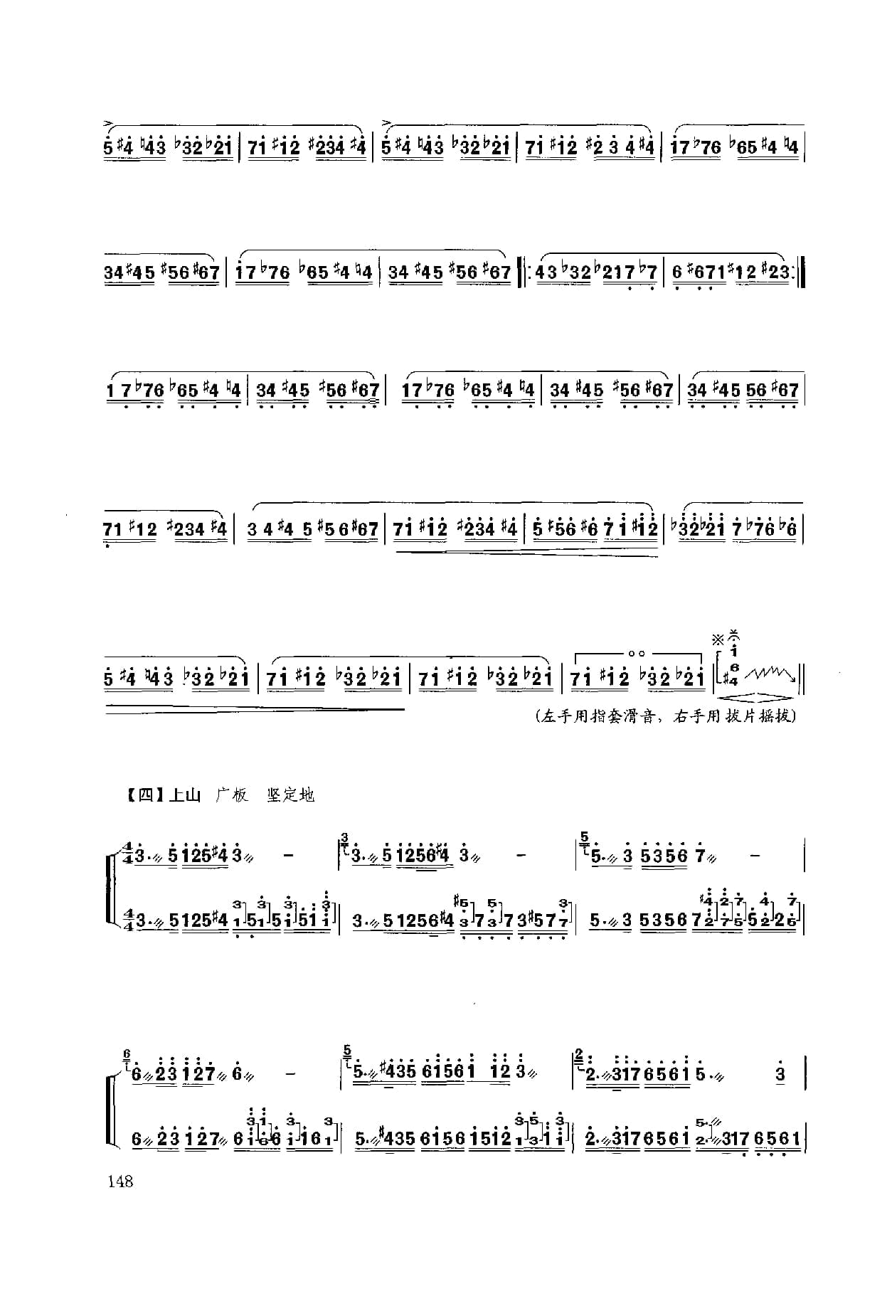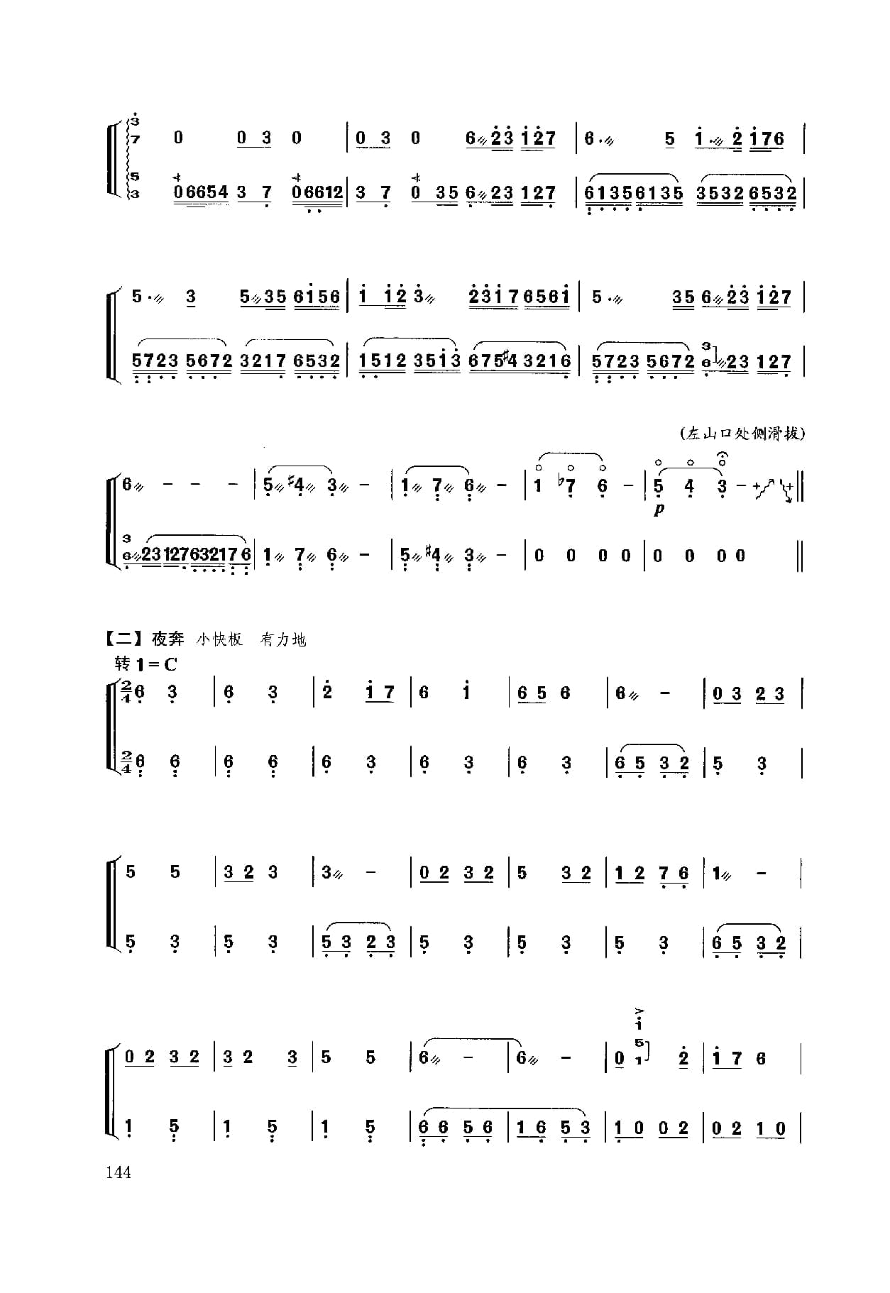 名称:扬琴经典曲目简谱:林冲夜奔 项祖华曲国家:中国分类:民族乐器谱子类:扬琴谱类型:简谱文件格式:jpg乐曲以昆曲音调为素材,描写林冲英雄落难,怒火满腔,顶风踏雪,夜奔梁山的豪情壮举演奏时注意:1.引子: 四音和弦力度铿锵,“急急风”锣鼓点节奏逐渐密集,运用气息配合,情绪激昂悲壮;2.慢板:轮音均匀结实,韵味浓郁,韵律鲜明;3.快板:节奏鲜明,层次清晰;4.结束句八度二连音和弦轮音运用脆臂合力持续强奏。