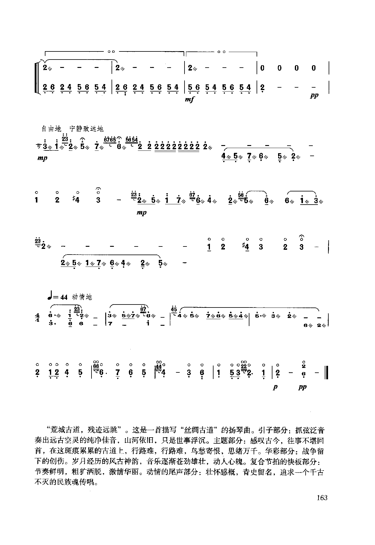 “荒城古道,残迹远眺”。这是一首描写“丝绸古道”的扬琴曲。引子部分:抓弦泛音奏出远古空灵的纯净佳音,山河依旧,只是世事浮沉。主题部分:感叹古今,往事不堪回首,在这斑痕累累的古道上,行路难,行路难,鸟愁寄恨,思绪万千。华彩部分:战争留下的创伤。岁月经历的风古神韵,音乐逐渐苍劲雄壮,动人心魄。复合节拍的快板部分:节奏鲜明,粗犷洒脱,激情华丽。动情的尾声部分:壮怀感,青史留名,追求一个千古不灭的民族魂传唱。