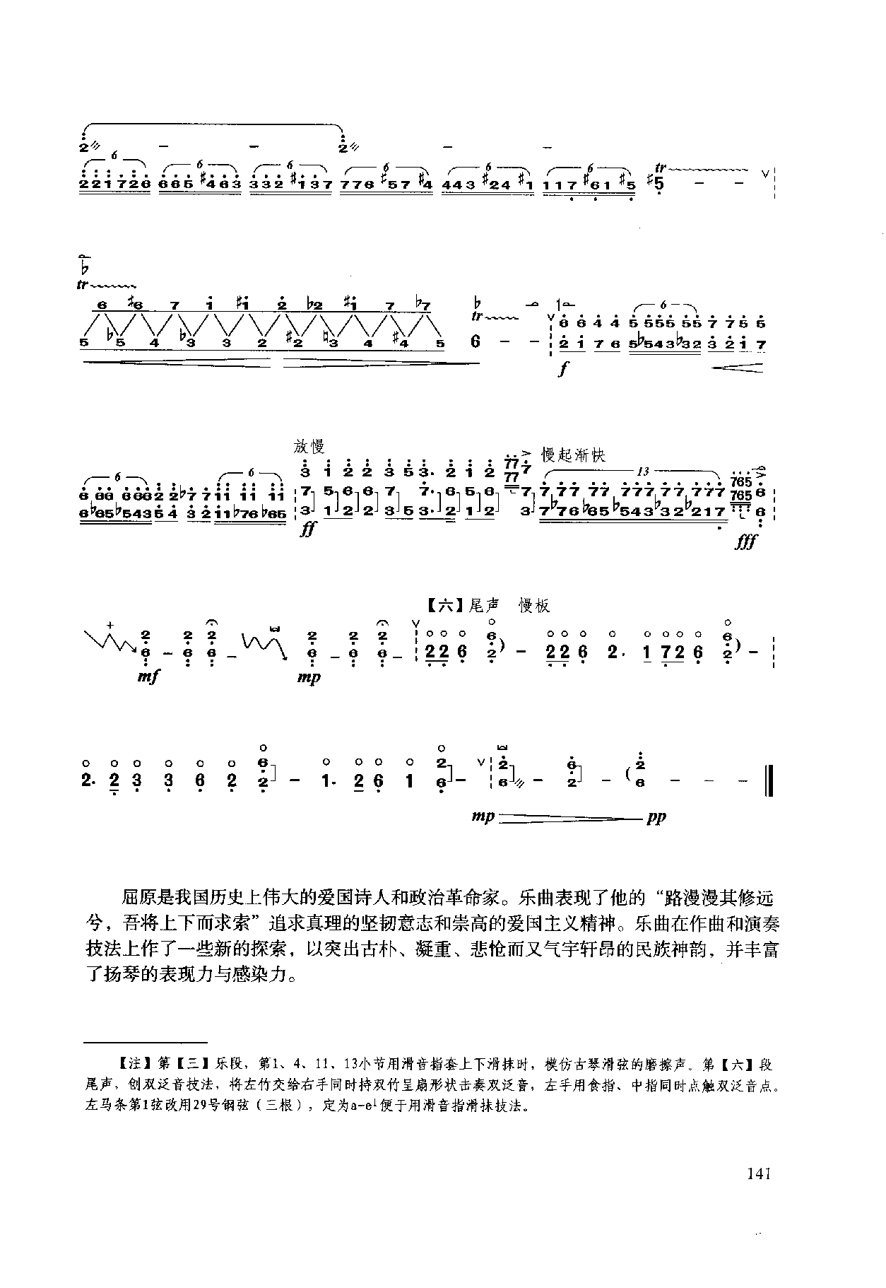 屈原是我国历史上伟大的爱国诗人和政治革命家。乐曲表现了他的“路漫漫其修远兮,吾将上下而求索”追求真理的坚韧意志和崇高的爱国主义精神。乐曲在作曲和演奏技法上作了一些新的探索,以突出古朴、凝重、悲怆而又气字轩昂的民族神韵,并丰富了扬琴的表现力与感染力。