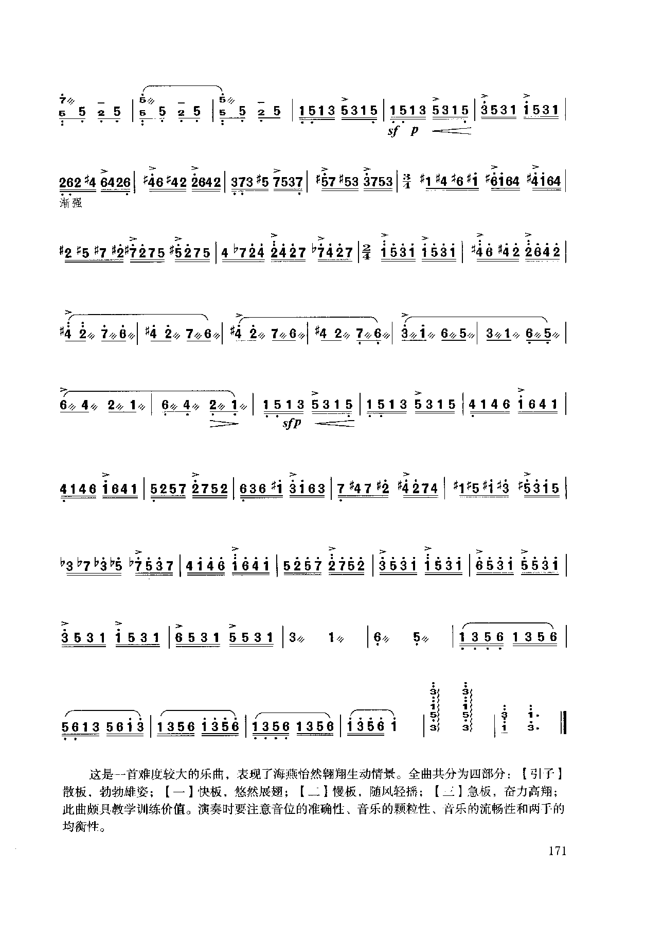 这是--首难度较大的乐曲,表现了海燕怡然翱翔生动情景。全曲共分为四部分:【引子】散板,勃勃雄姿;【一】快板,悠然展翅;【】慢板,随风轻摇;【二】急板,奋力高翔;此曲颇具教学训练价值。演奏时要注意音位的准确性、音乐的颗粒性、音乐的流畅性和两于的均衡性。