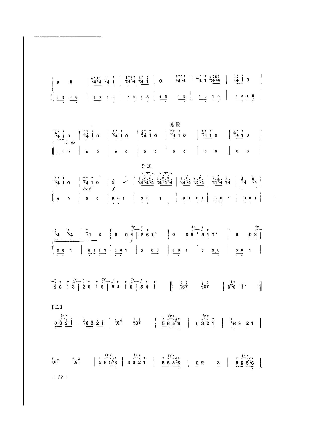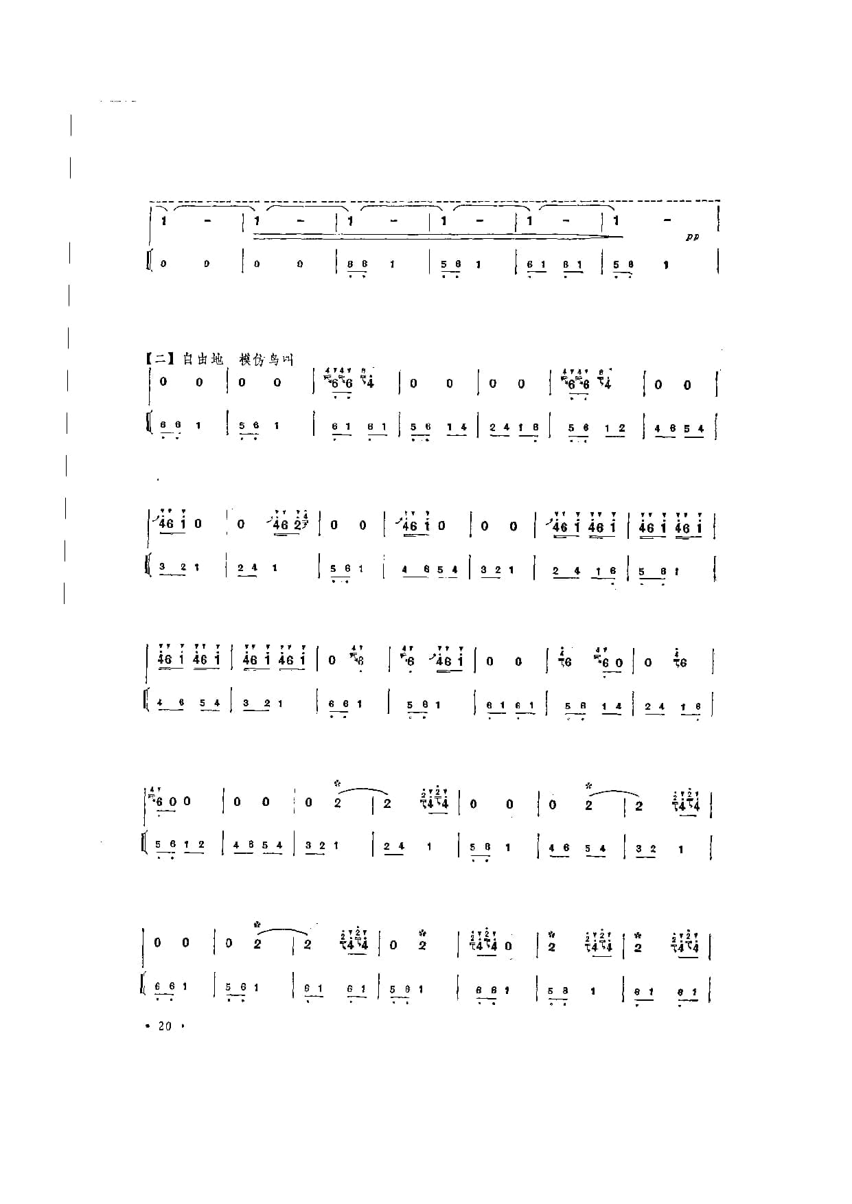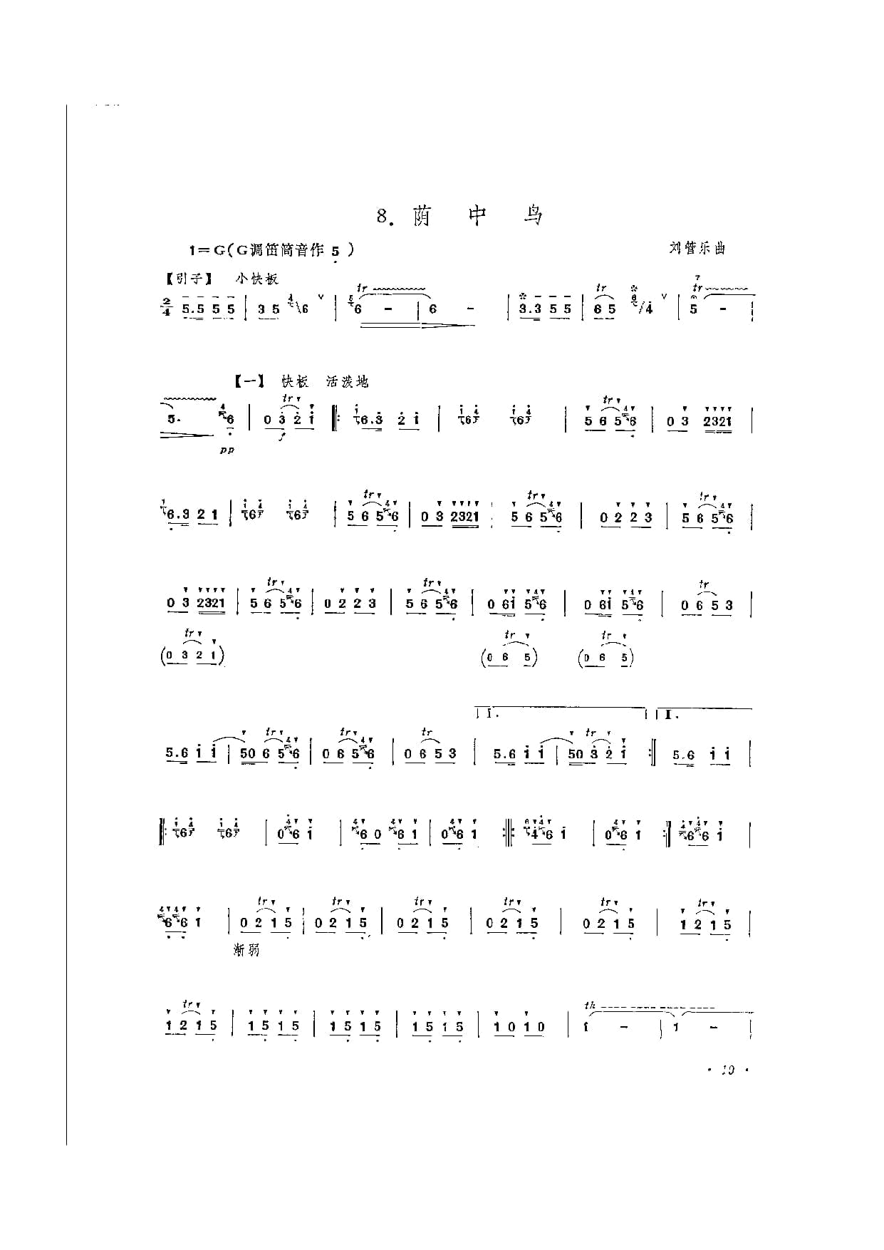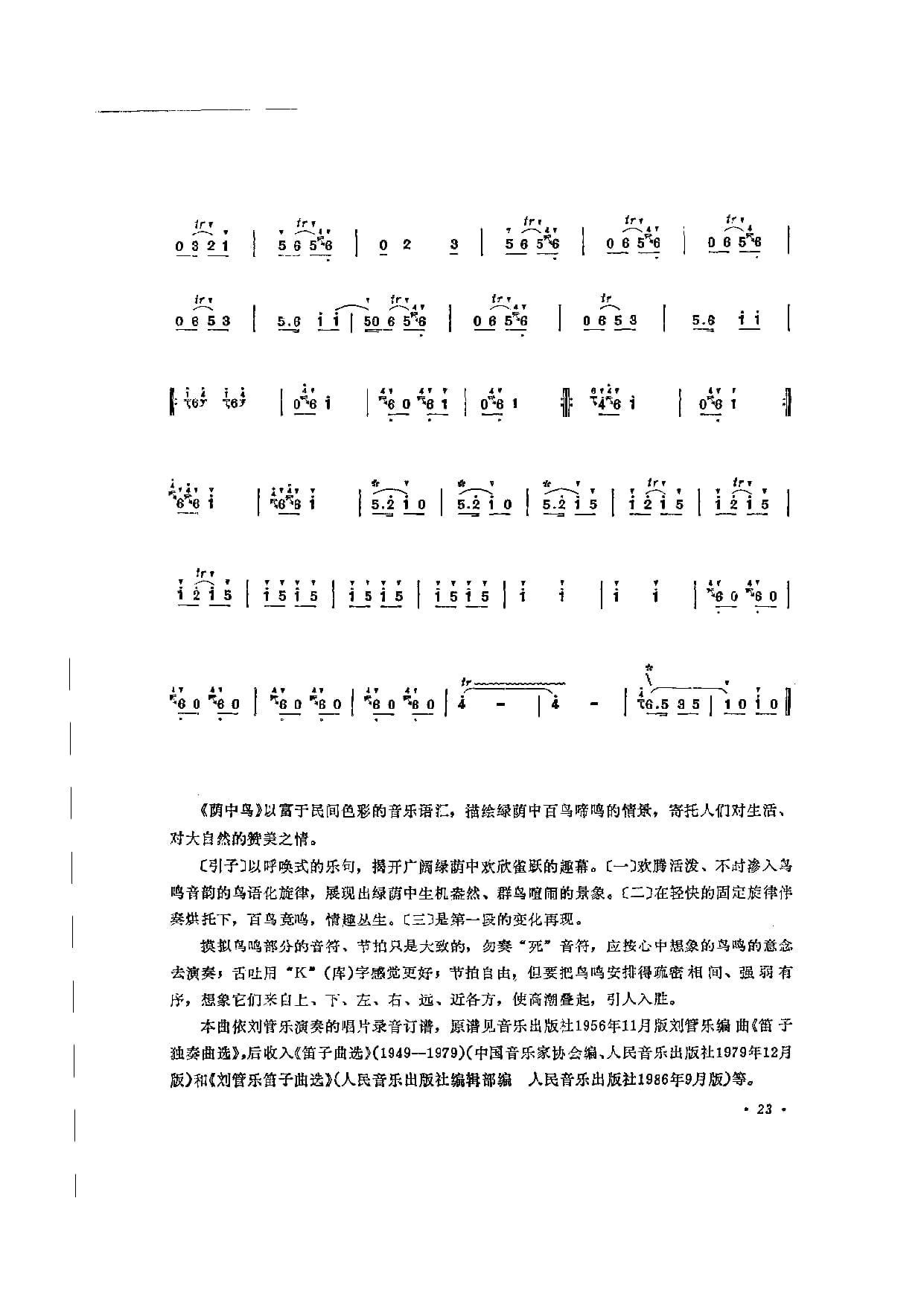 名称:笛子独奏曲简谱:荫中鸟 刘管乐曲 附教学及赏析国家:中国分类:民族乐器谱子类:笛子谱类型:简谱文件格式:jpg《荫中鸟》以富于民间色彩的音乐语汇,绘绿荫中百鸟啼鸣的情景,寄托人们对生活、对大自然的赞美之情。[引子]以呼唤式的乐句,揭开广阔绿荫中欢欣雀跃的趣幕。〔一〕欢腾活泼、不时渗入鸟鸣音韵的鸟语化旋律,展现出绿荫中生机然、群鸟喧闹的景象。[二〕在轻快的固定旋律伴奏烘托下,百鸟竞鸣,情趣丛生。[三]是第一段的变化再现。