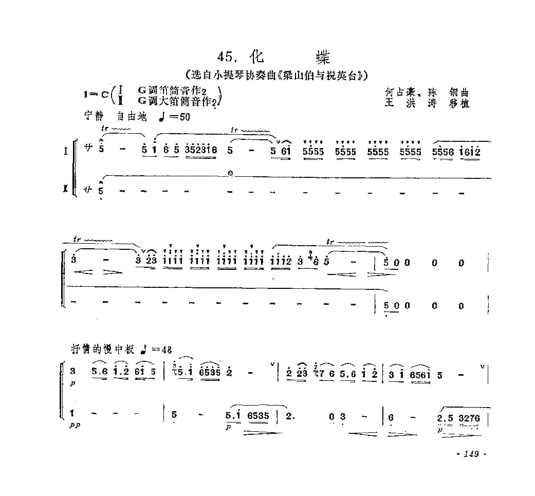 名称:竹笛二重奏简谱:化蝶 选自小提琴协奏曲 梁山伯与祝英台 何占豪 陈钢曲 王洪涛移植国家:中国分类:民族乐器谱子类:笛子谱类型:简谱文件格式:jpg竹笛二重奏简谱:化蝶(选自小提琴协奏曲《梁山伯与祝英台》) 何占豪 陈钢曲 王洪涛移植