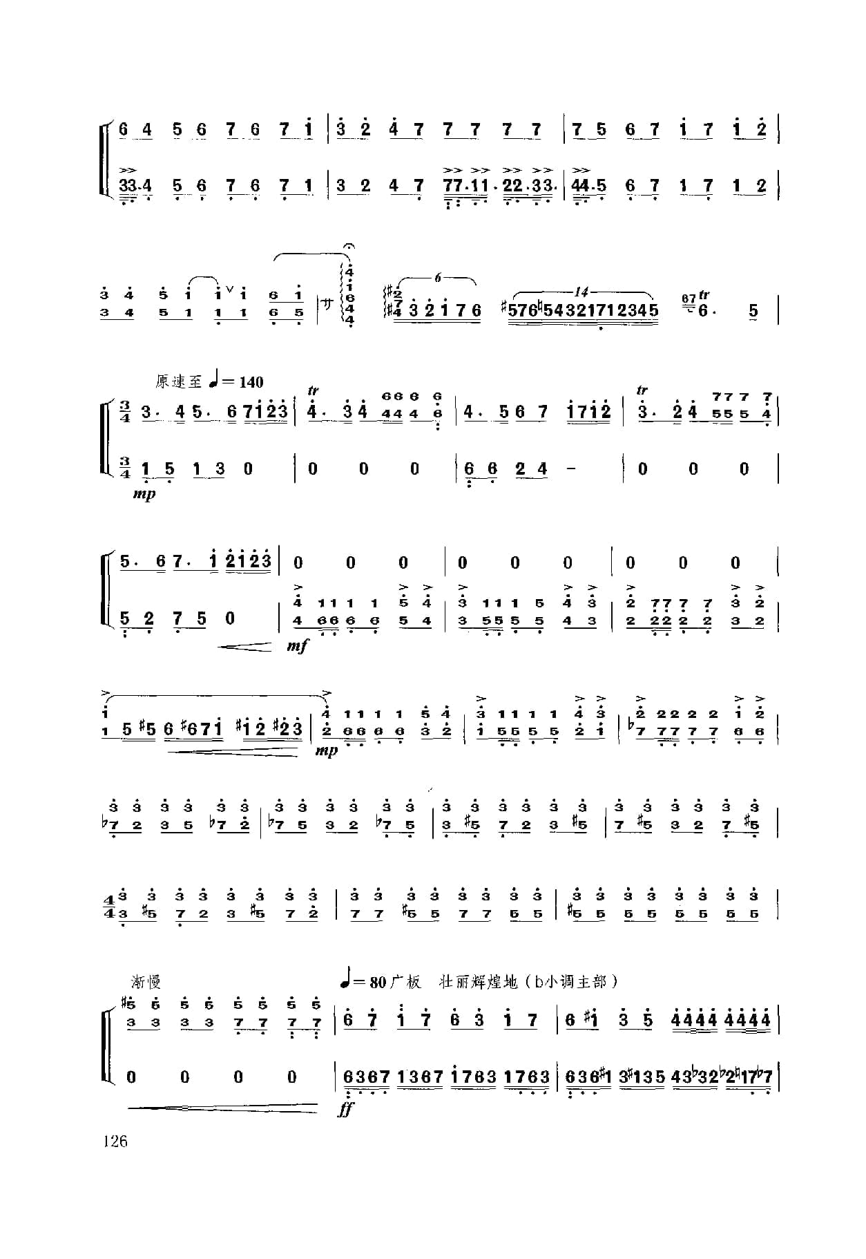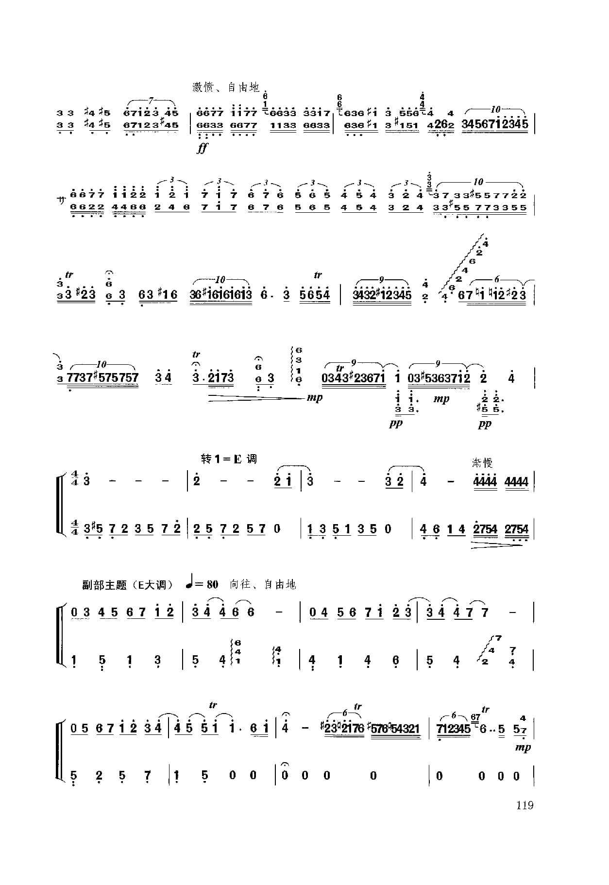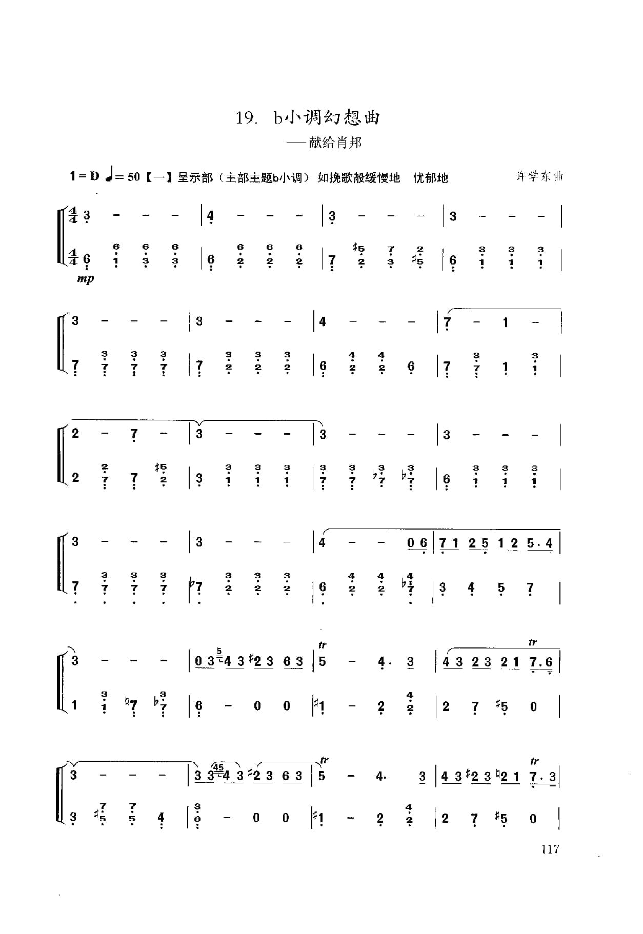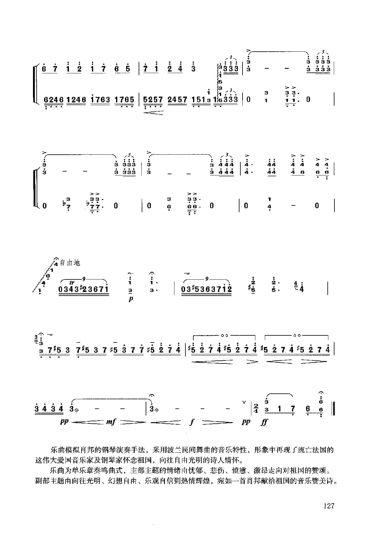 名称:扬琴经典曲目简谱:b小调幻想曲 献给肖邦 许学东曲国家:中国分类:民族乐器谱子类:扬琴谱类型:简谱文件格式:jpg乐曲模拟肖邦的钢琴演奏手法,采用波一民间舞曲的音乐特性,形象中再现了流亡法国的这伟大爱国音乐家及钢琴家怀念祖国,向往自由光明的诗人情怀。乐曲为单乐章奏鸣曲式,主部主题的情绪由忧郁、悲伤、愤懑、激昂走向对祖国的赞颂。副部主题由向往光明、幻想自由、乐观自信到热情辉煌,宛如一首肖邦献给祖国的音乐赞关诗。