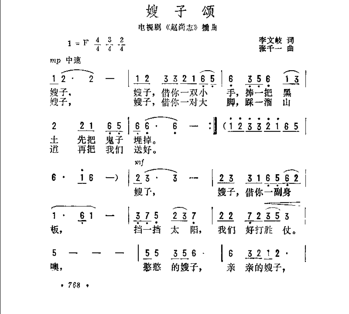 嫂子颂(电视剧《赵尚志》插曲)李文岐词 张千一曲简谱歌词是曲谱查询网于2025年02月14日 20:52:54更新在曲谱投稿频道中的内容,收录在曲谱投稿栏目中;曲谱查询网分享的嫂子颂(电视剧《赵尚志》插曲)李文岐词 张千一曲简谱五线谱高清图片,欢迎在线免费下载;曲谱查询网无需注册,即可直接下载海量歌曲谱与乐器学习相关资料。