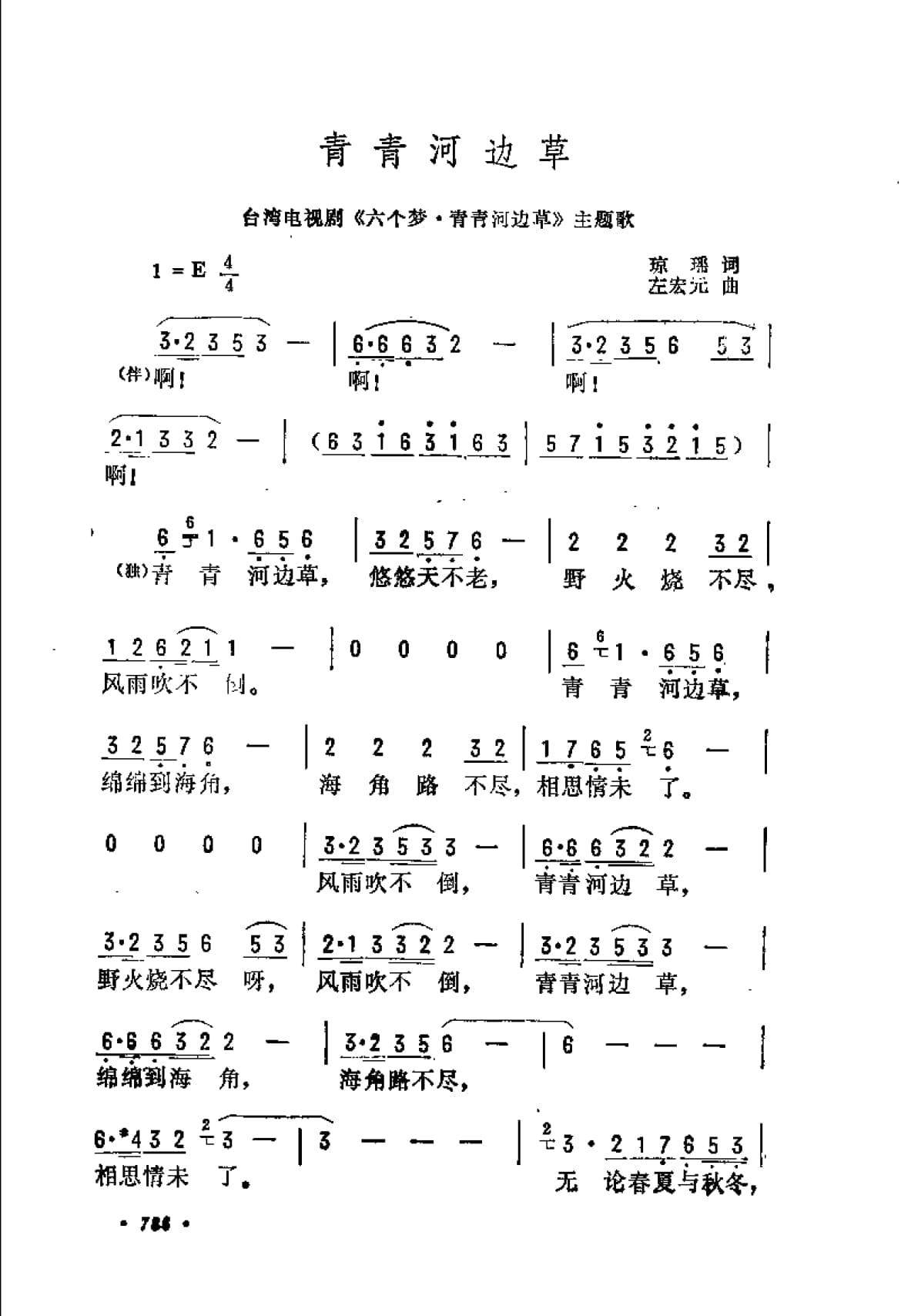 名称:青青河边草 台湾电视剧 六个梦 青青河边草 主题歌 琼瑶词 左宏元曲国家:中国分类:曲谱子类:投稿类型:简谱/五线谱文件格式:jpg青青河边草(台湾电视剧《六个梦·青青河边草》主题歌)琼瑶词 左宏元曲