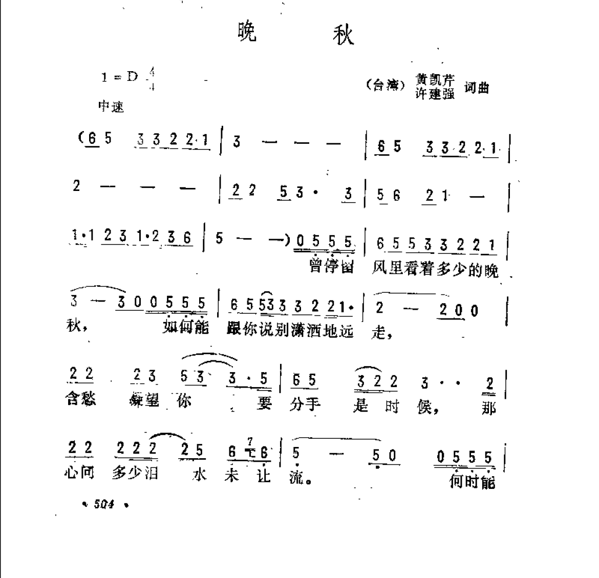 晚秋(台湾)黄凯芹、许建强词曲简谱歌词是曲谱查询网于2025年02月13日 17:37:11更新在乐谱曲谱频道中的内容,收录在乐谱曲谱栏目中;曲谱查询网分享的晚秋(台湾)黄凯芹、许建强词曲简谱五线谱高清图片,欢迎在线免费下载;曲谱查询网无需注册,即可直接下载海量歌曲谱与乐器学习相关资料。