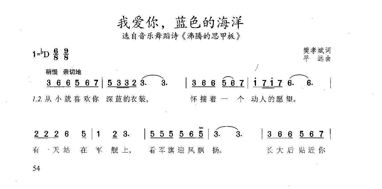 音乐剧简谱:我爱你,蓝色的海洋——选自音乐舞蹈诗《沸腾的甲板》 樊孝斌词 平远曲