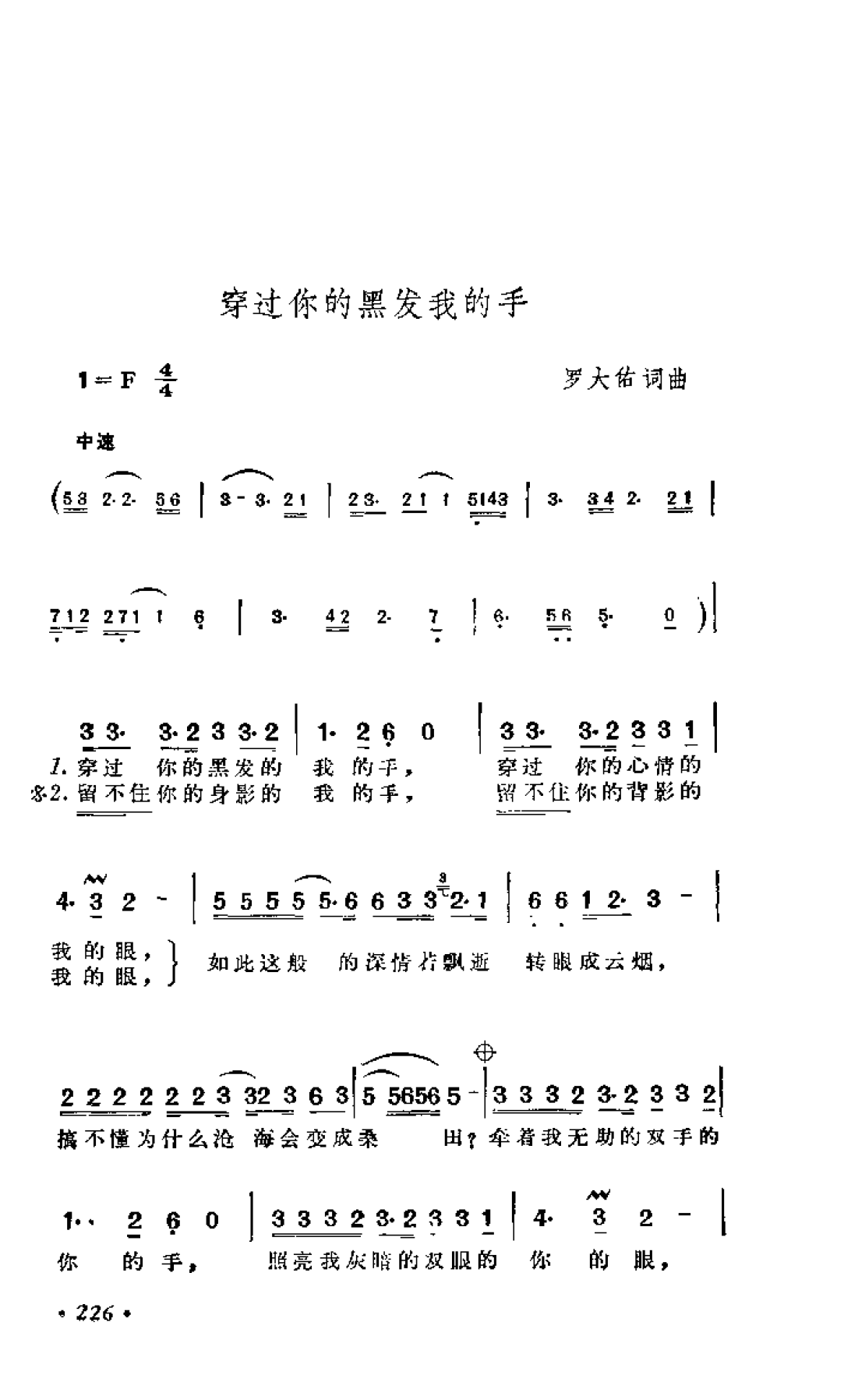 穿过你的黑发我的手 罗大佑词曲简谱歌词是曲谱查询网于2025年01月09日 11:14:07更新在通俗歌曲谱频道中的内容,收录在通俗歌曲谱栏目中;曲谱查询网分享的穿过你的黑发我的手 罗大佑词曲简谱五线谱高清图片,欢迎在线免费下载;曲谱查询网无需注册,即可直接下载海量歌曲谱与乐器学习相关资料。