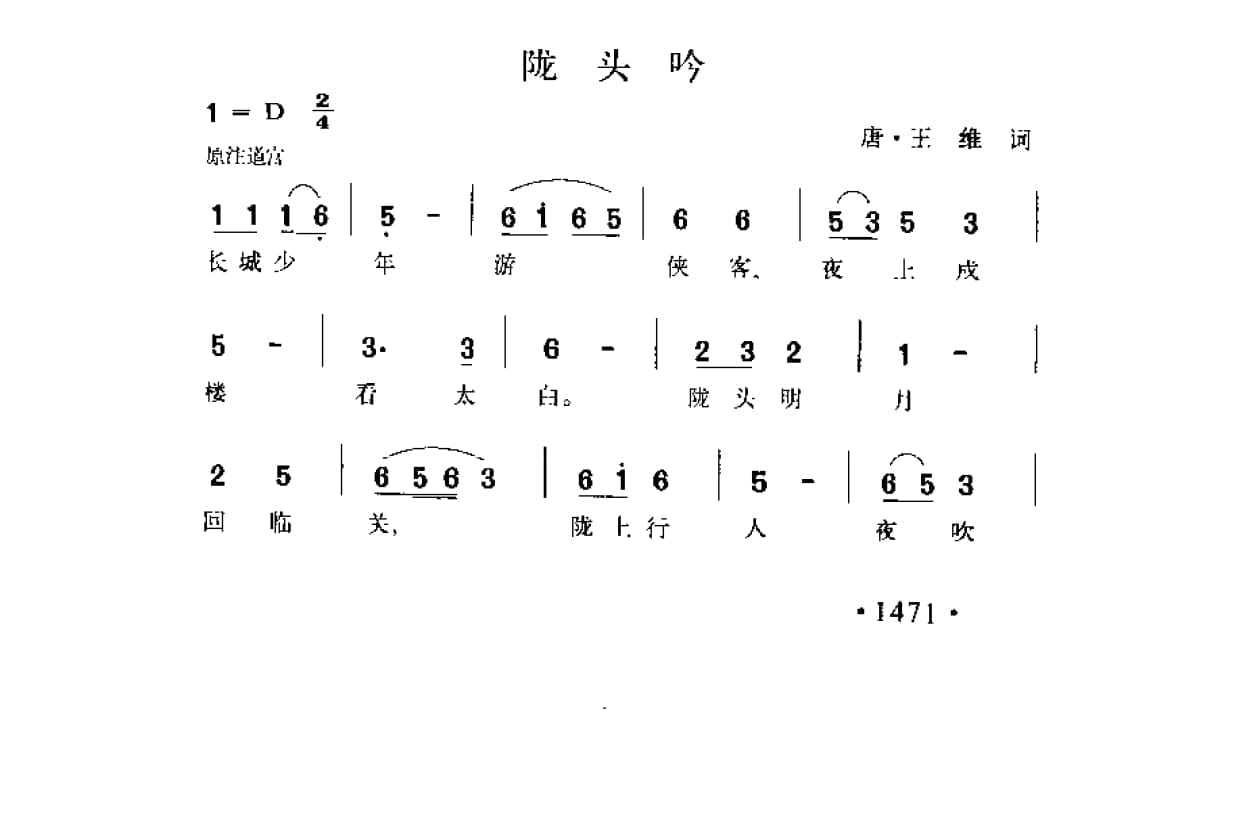 名称:陇头吟 唐 王维词国家:中国分类:声乐谱子类:民族唱法歌谱类型:简谱/五线谱文件格式:jpg
