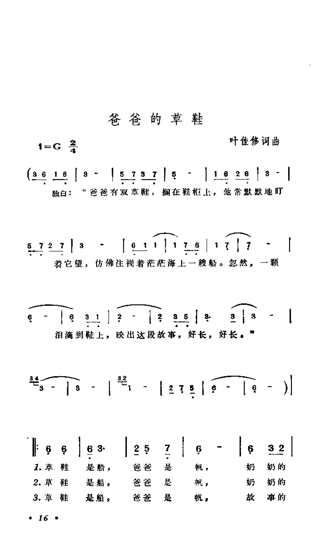 爸爸的草鞋 叶佳修词曲简谱歌词是曲谱查询网于2025年01月08日 16:24:18更新在通俗歌曲谱频道中的内容,收录在通俗歌曲谱栏目中;曲谱查询网分享的爸爸的草鞋 叶佳修词曲简谱五线谱高清图片,欢迎在线免费下载;曲谱查询网无需注册,即可直接下载海量歌曲谱与乐器学习相关资料。