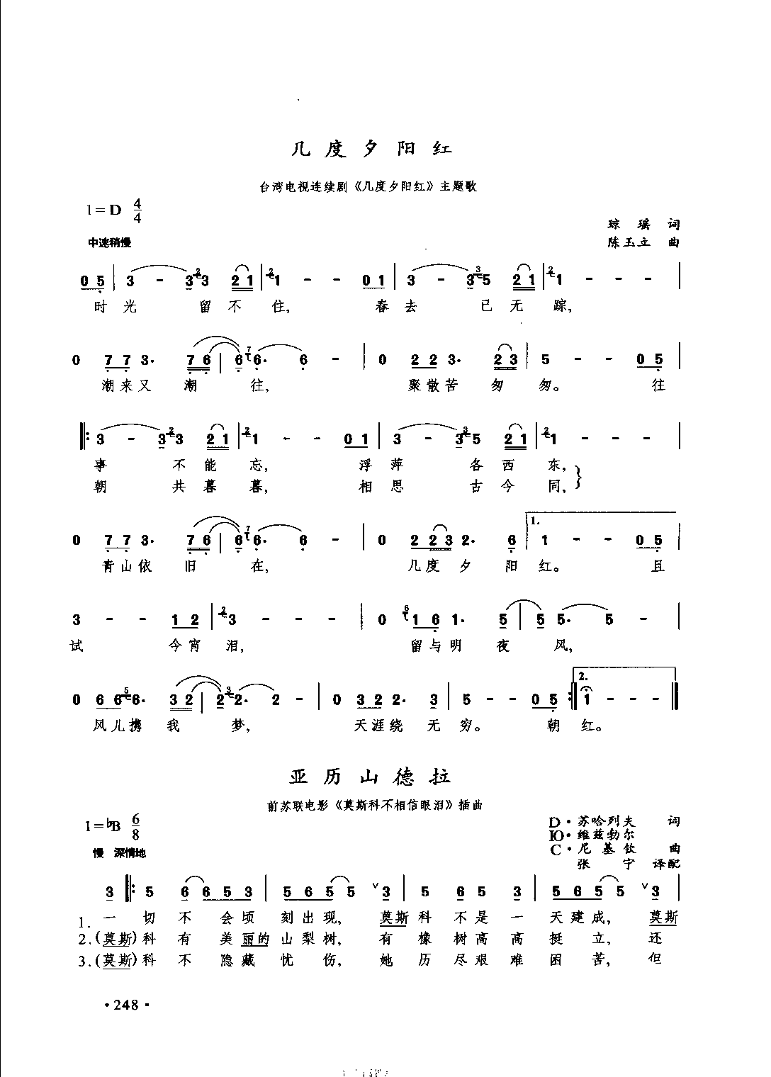 几度夕阳红(台湾电视连续剧《几度夕阳红》主题歌 琼瑶词 陈玉立曲)简谱歌词是曲谱查询网于2025年01月04日 14:08:33更新在通俗歌曲谱频道中的内容,收录在通俗歌曲谱栏目中;曲谱查询网分享的几度夕阳红(台湾电视连续剧《几度夕阳红》主题歌 琼瑶词 陈玉立曲)简谱五线谱高清图片,欢迎在线免费下载;曲谱查询网无需注册,即可直接下载海量歌曲谱与乐器学习相关资料。