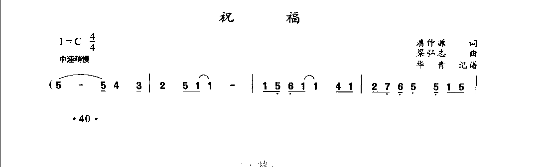 祝福(潘仲源词 梁弘志曲)简谱歌词是曲谱查询网于2025年01月03日 14:24:44更新在通俗歌曲谱频道中的内容,收录在通俗歌曲谱栏目中;曲谱查询网分享的祝福(潘仲源词 梁弘志曲)简谱五线谱高清图片,欢迎在线免费下载;曲谱查询网无需注册,即可直接下载海量歌曲谱与乐器学习相关资料。
