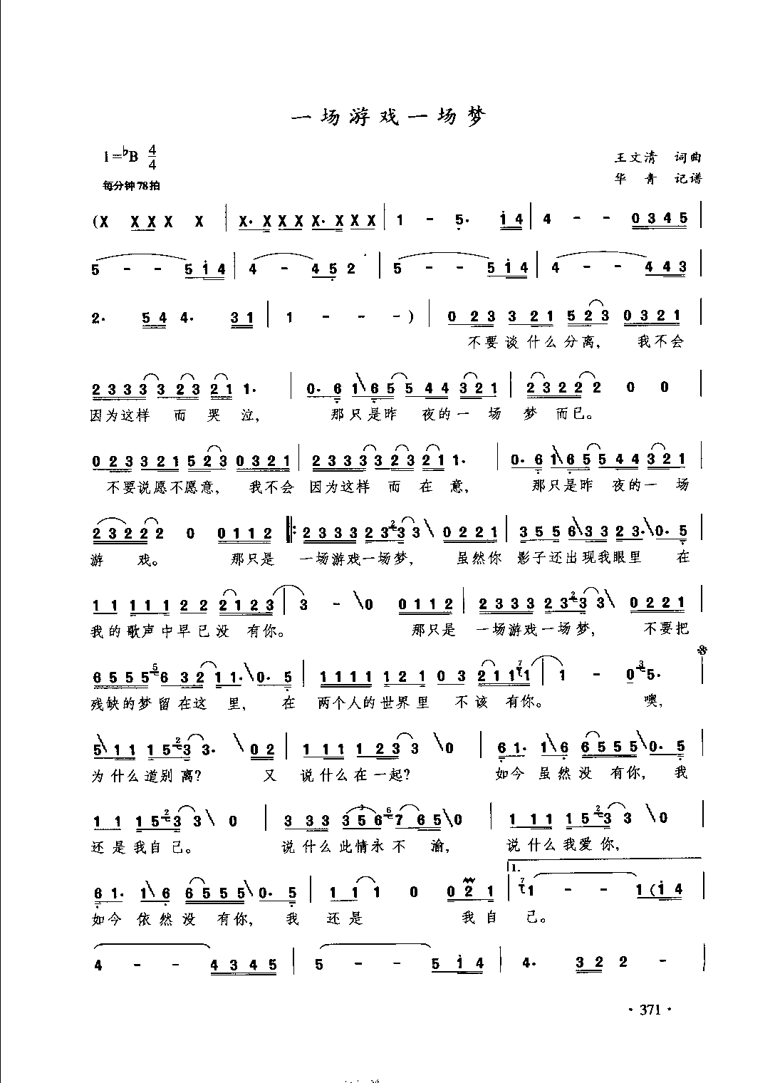 一场游戏一场梦(王文清词曲)简谱歌词是曲谱查询网于2025年01月05日 13:11:57更新在通俗歌曲谱频道中的内容,收录在通俗歌曲谱栏目中;曲谱查询网分享的一场游戏一场梦(王文清词曲)简谱五线谱高清图片,欢迎在线免费下载;曲谱查询网无需注册,即可直接下载海量歌曲谱与乐器学习相关资料。