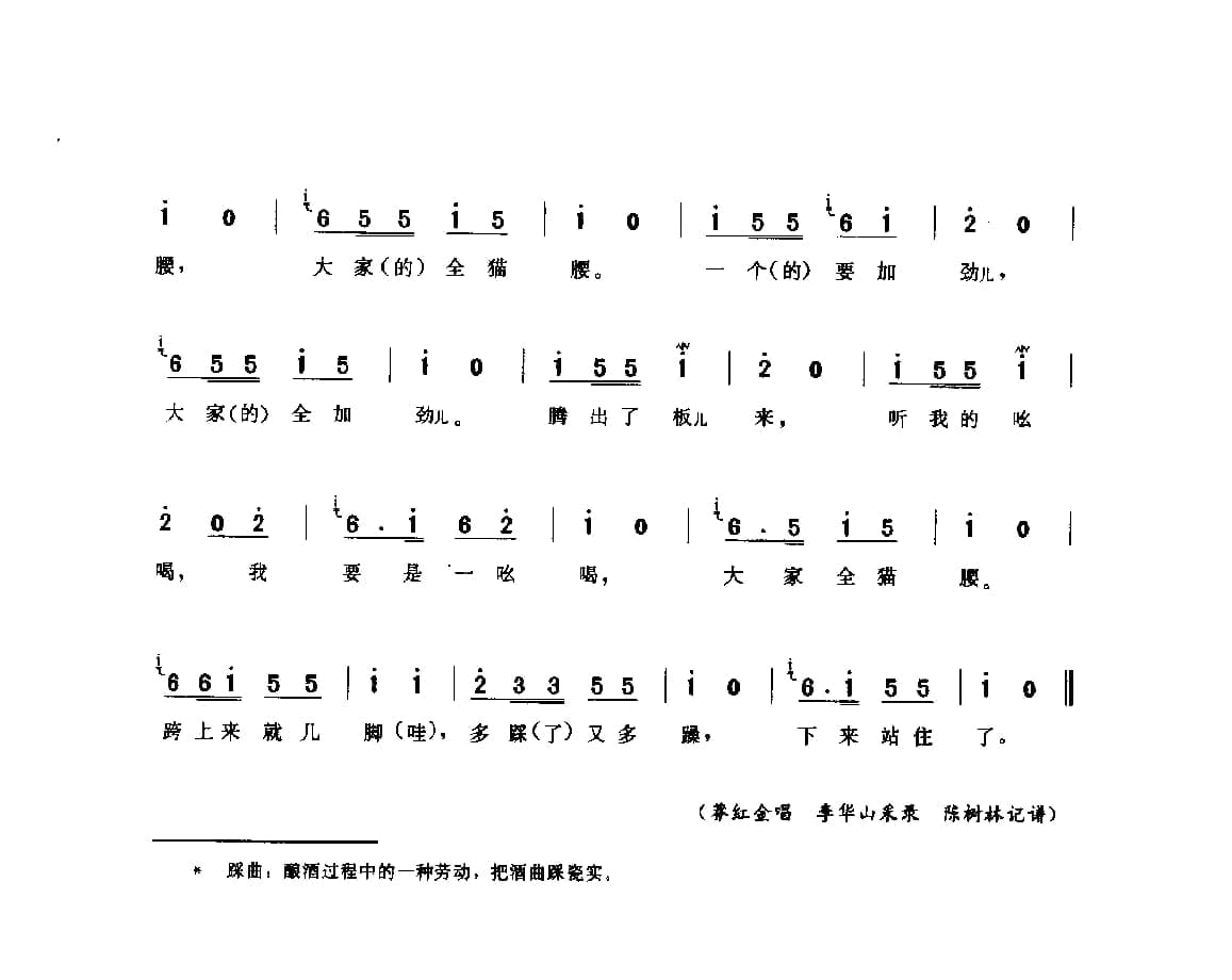 名称:劳动号子:踩曲歌 一 顺义县 号子释文 北京民间歌曲简谱国家:中国分类:声乐谱子类:原生态唱法歌谱类型:简谱文件格式:jpg