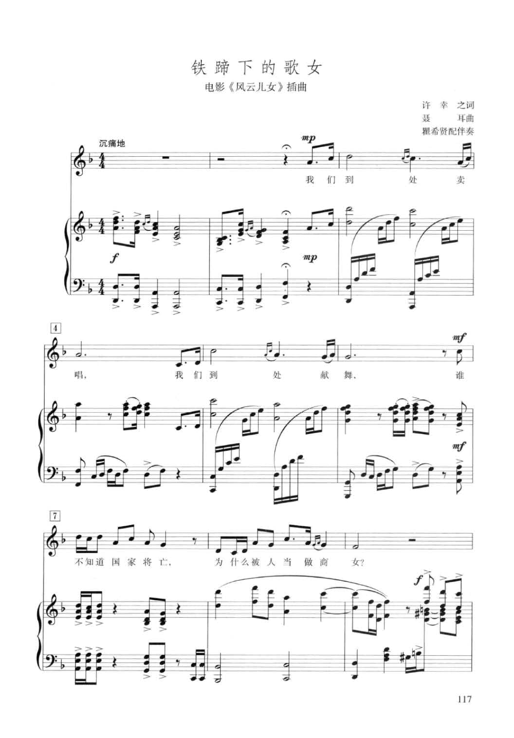 名称:铁蹄下的歌女 电影 风云儿女 插曲 许幸之词 聂耳曲国家:中国分类:声乐谱子类:民族唱法歌谱类型:五线谱文件格式:jpg