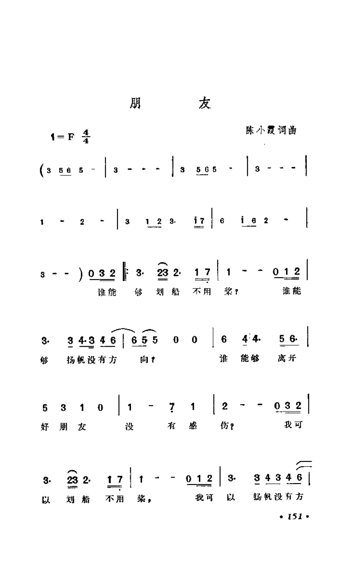 名称:朋友 陈小霞词曲国家:中国分类:声乐谱子类:通俗唱法歌谱类型:简谱/五线谱文件格式:jpg