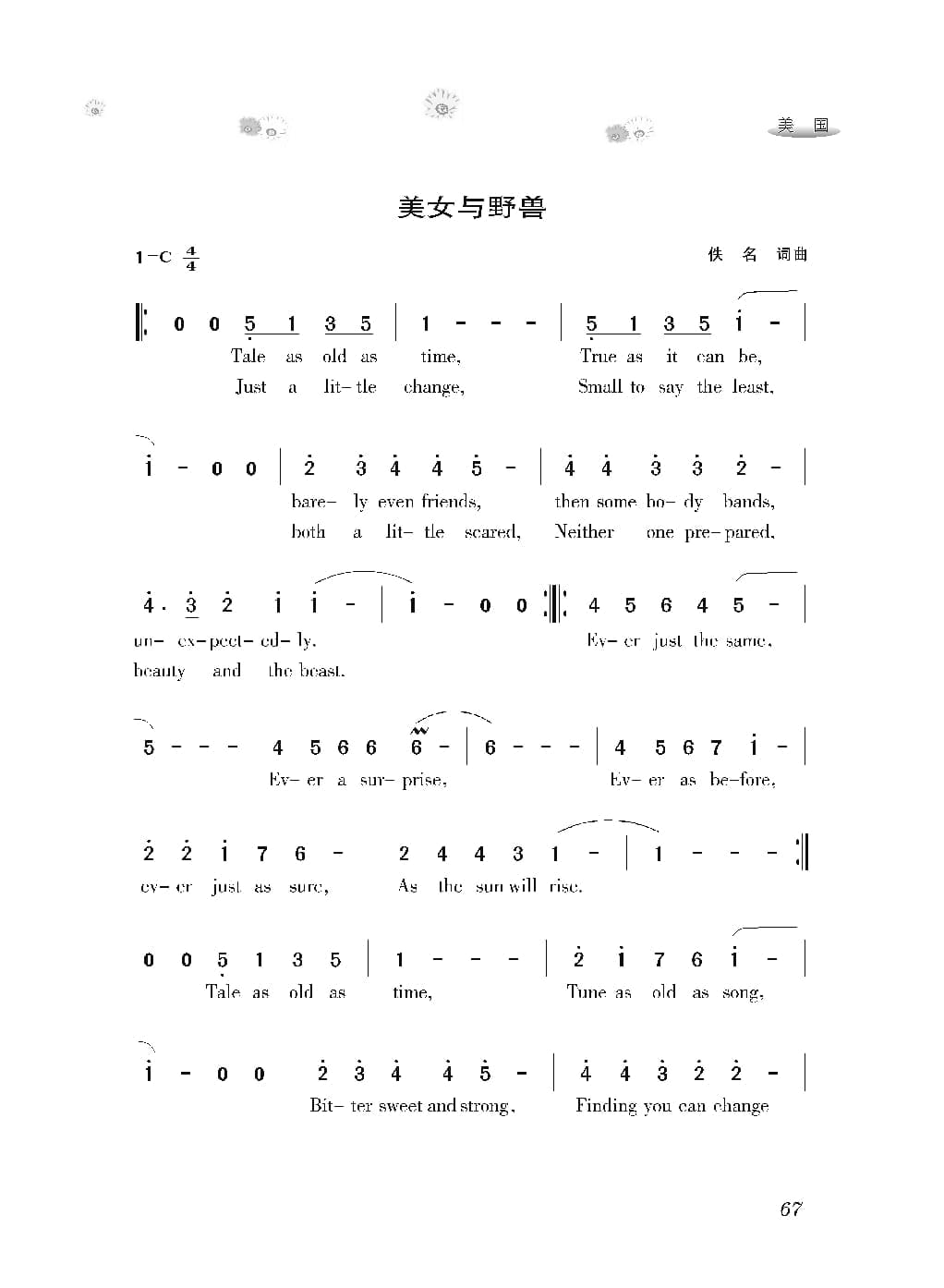 名称:美国经典歌曲谱:美女与野兽 简谱