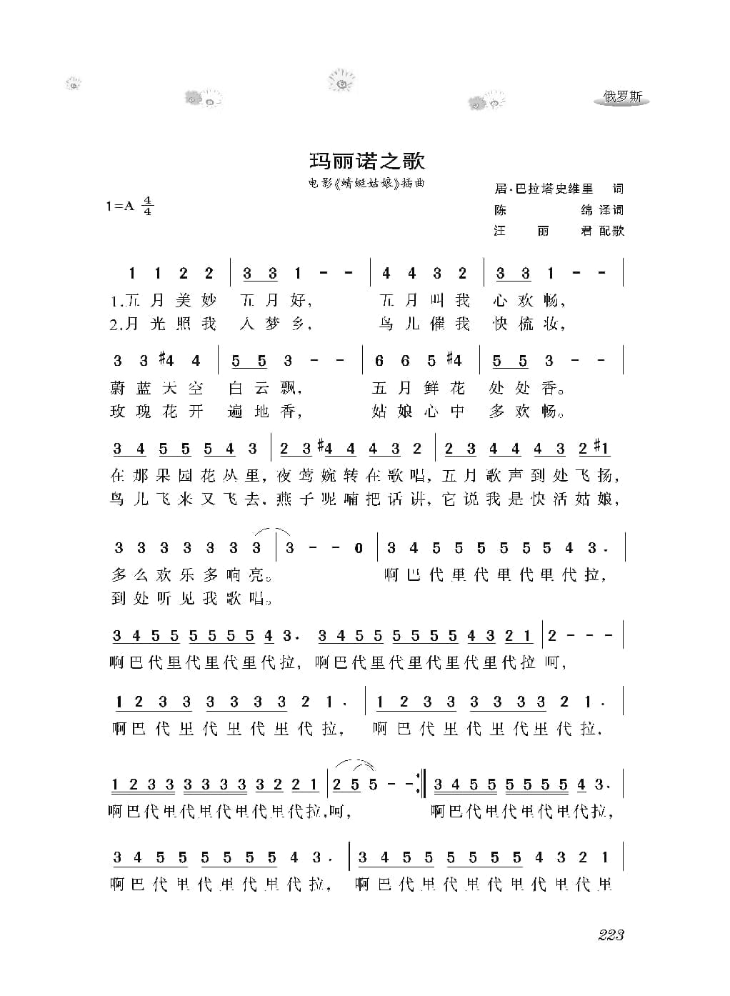 名称:俄罗斯经典歌曲谱:玛丽诺之歌 简谱国家:俄罗斯分类:歌谱子类:外国歌谱类型:简谱文件格式:jpg