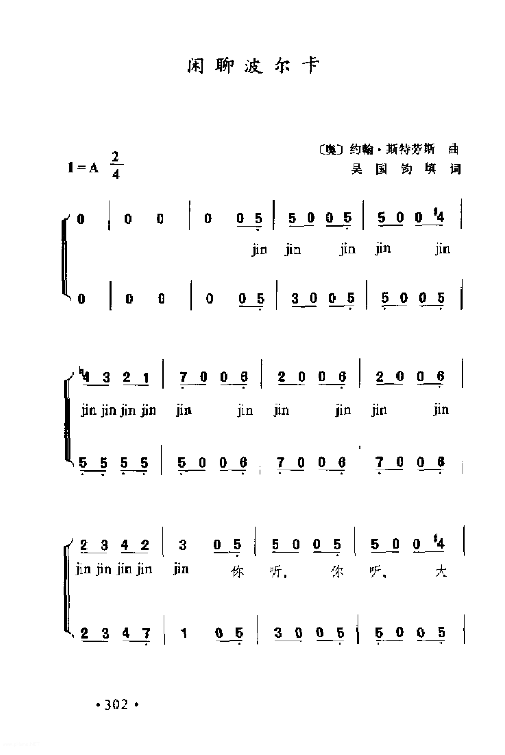外国古典歌曲简谱:闲聊波尔卡(奥)约翰 斯特劳斯曲简谱歌词是曲谱查询网于2025年02月05日 08:27:04更新在外国曲谱频道中的内容,收录在外国曲谱栏目中;曲谱查询网分享的外国古典歌曲简谱:闲聊波尔卡(奥)约翰 斯特劳斯曲简谱五线谱高清图片,欢迎在线免费下载;曲谱查询网无需注册,即可直接下载海量歌曲谱与乐器学习相关资料。