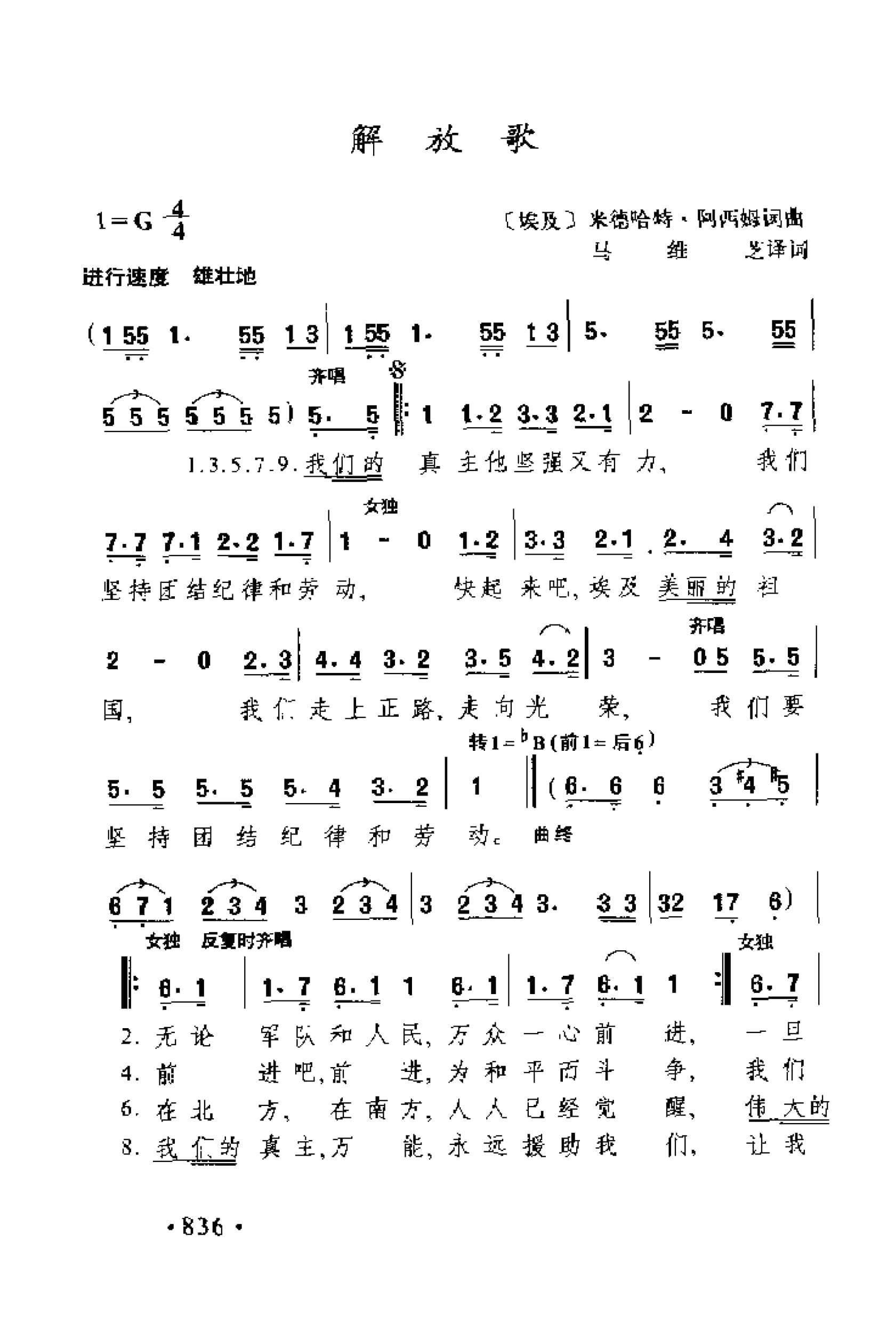 名称:外国现代歌曲简谱:解放歌 埃及 米德哈特 阿西姆曲国家:埃及分类:歌谱子类:外国歌谱类型:简谱文件格式:jpg