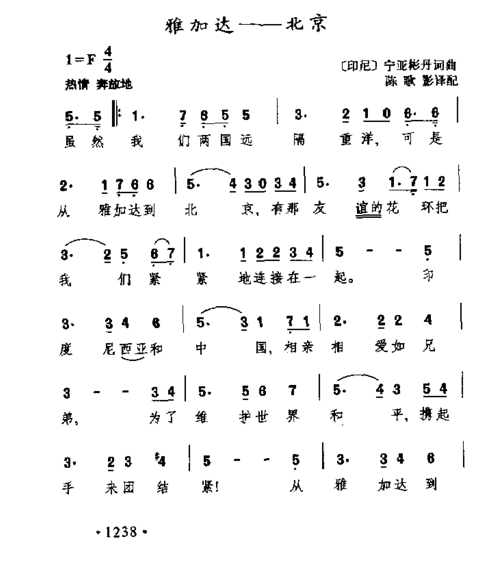 名称:雅加达 北京 印尼 宁亚彬丹曲国家:中国分类:歌谱子类:外国歌谱类型:简谱/五线谱文件格式:jpg