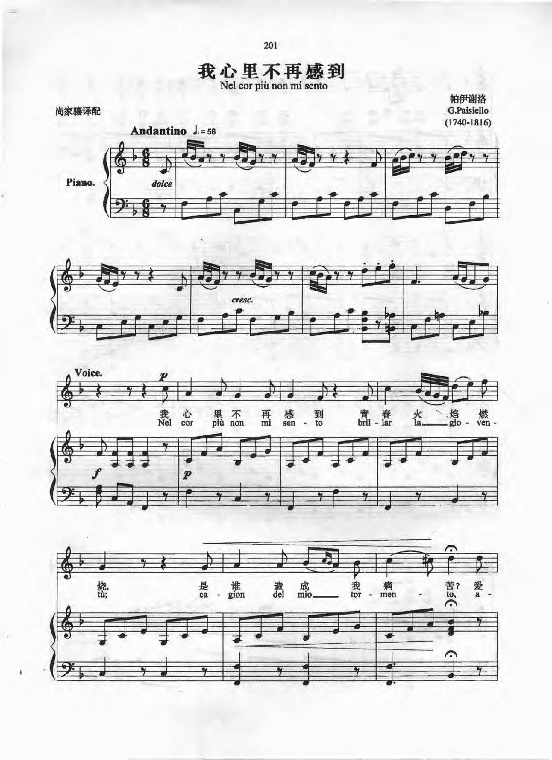 名称:意大利歌曲:我心里不再感到 Nel cor più non mi sento 帕伊谢洛 G.Paisiello,1740 1806 五线谱国家:意大利分类:歌谱子类:外国歌谱类型:五线谱文件格式:jpg意大利歌曲:我心里不再感到(Nel cor più non mi sento)帕伊谢洛(G.Paisiello,1740-1806)五线谱