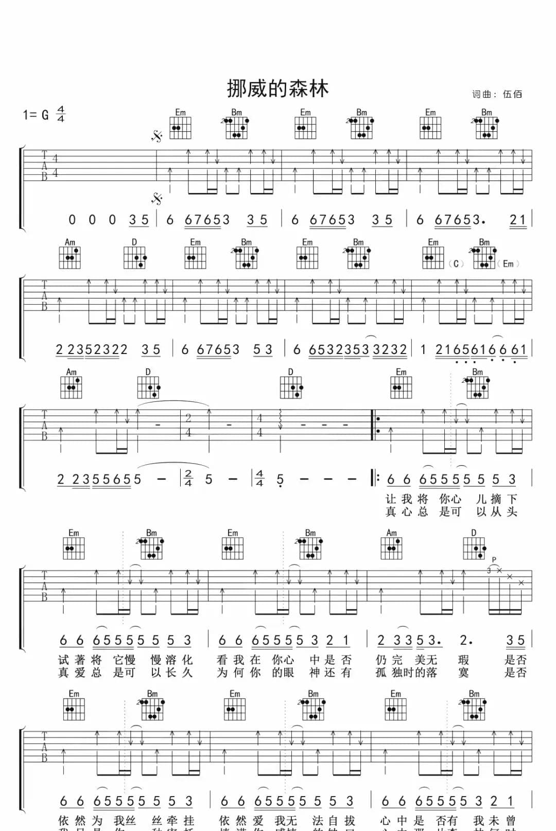 伍佰《挪威的森林》G调吉他谱(扫弦版)