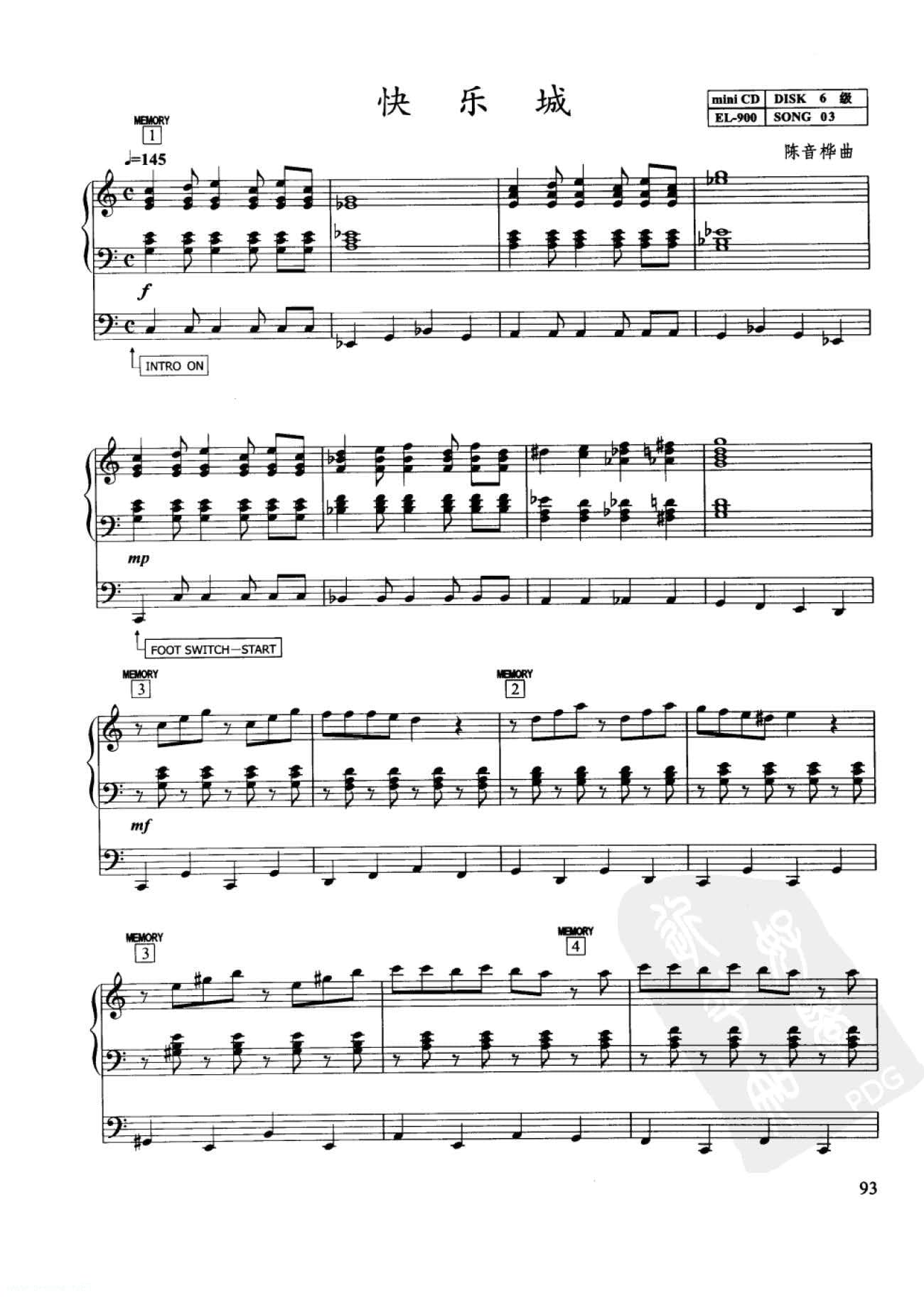 名称:双排键电子琴考级曲目:快乐城 陈音桦曲 六级 五线谱
