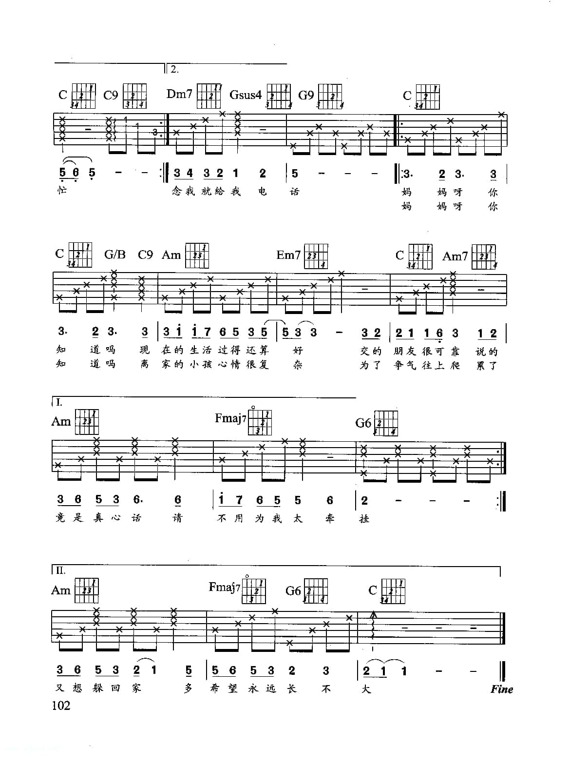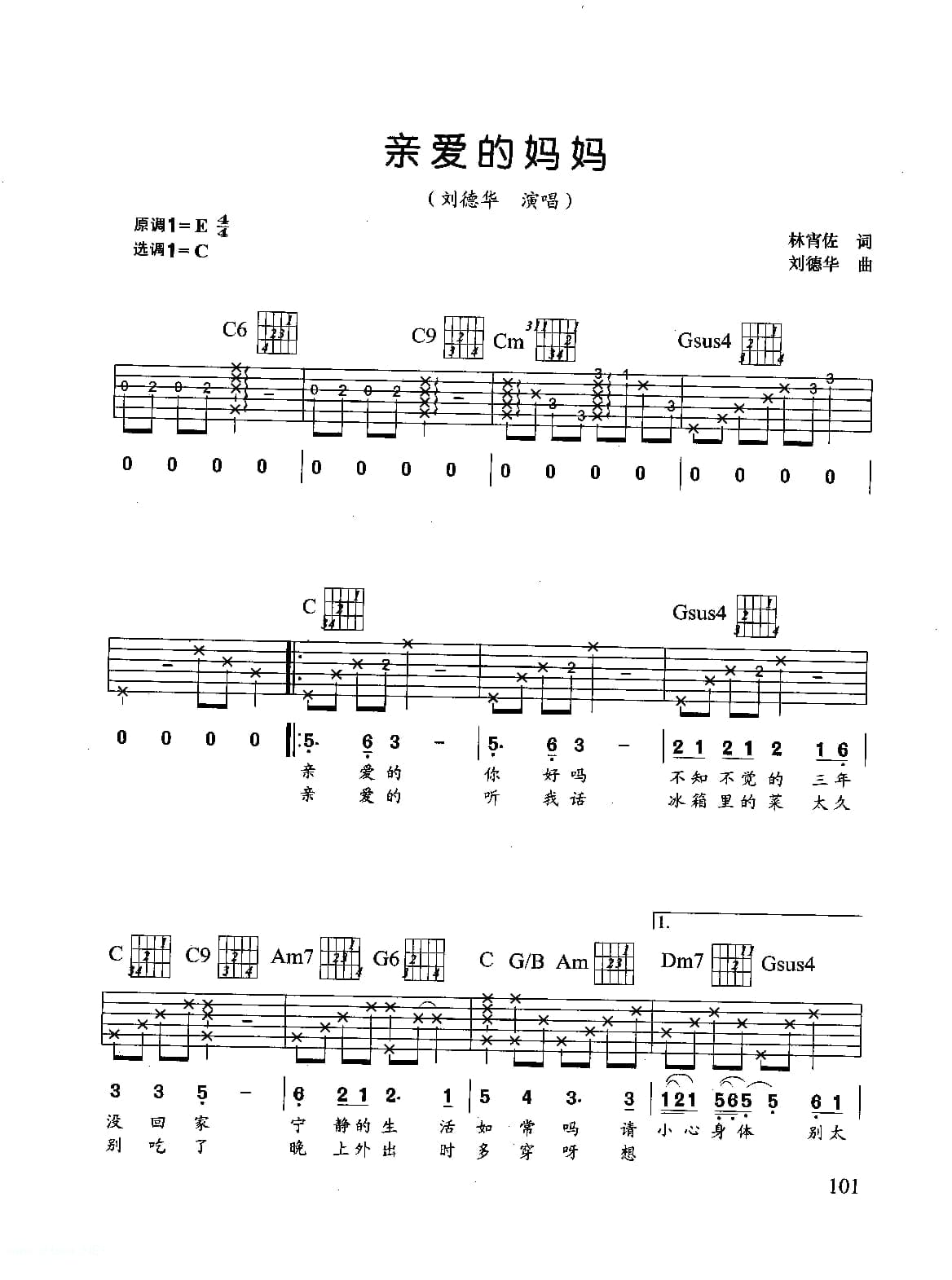 名称:刘德华歌曲吉他六线谱:亲爱的妈妈 附简谱歌词