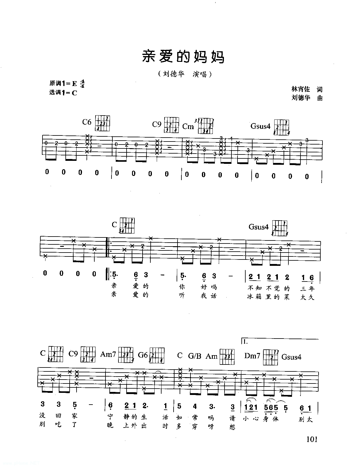 刘德华歌曲吉他六线谱:亲爱的妈妈(附简谱歌词)
