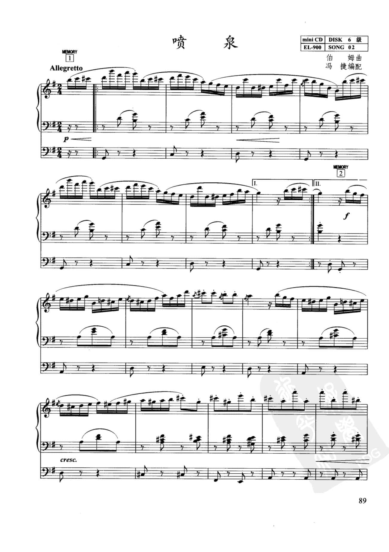 名称:双排键电子琴考级曲目:喷泉 伯姆曲 冯捷编配 六级 五线谱