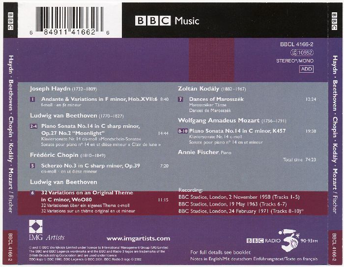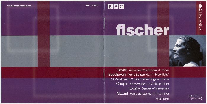BBC Legends BBCL 4166. Fischer: Haydn – Andante and Variations in F minor, Beethoven – Piano Sonata no.14 “Moonlight”, 32 Variations in C minor on a Original Theme, Chopin – Scherzo no.3 in C sharp minor, Kodaly – Dances of Marosszek, Mozart – Piano Sonata no.14 in C minor (APE)