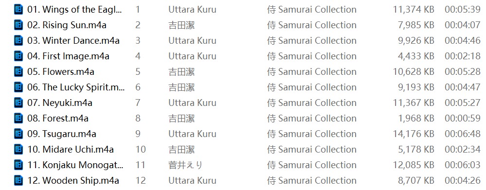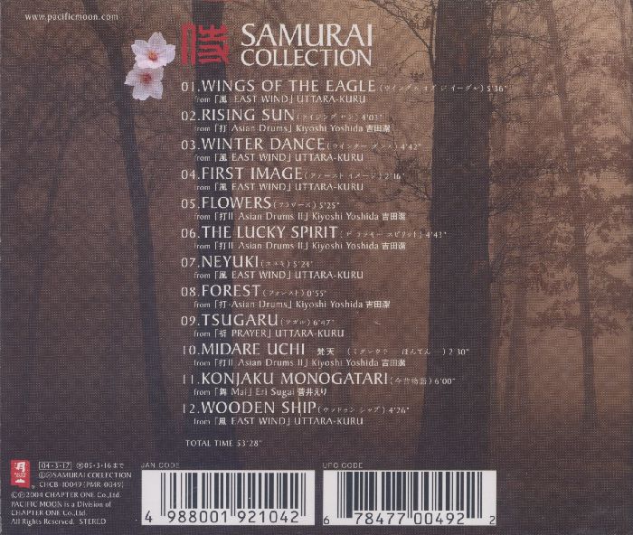 当然,就目前阶段,和平之月眼中最重要的国际市场应该还是美国,从这张专辑的名字《Samurai Collection 侍》就可看出端倪。美国人现在迷日本忍者和武士已经成痴了,尤其前几年汤帅哥的电影《最后的武士》上映,简直就是火上浇油。和平之月正是对症下药,选取都是浓郁的日本味,再配上精致的樱花与武士刀的封面设计,看来是打算在美国狠捞一笔。