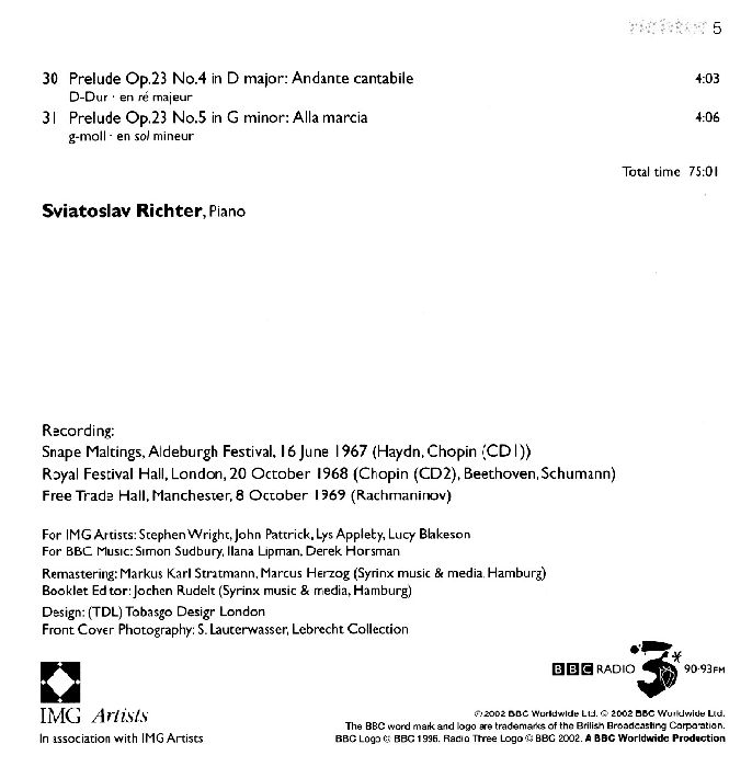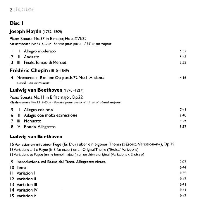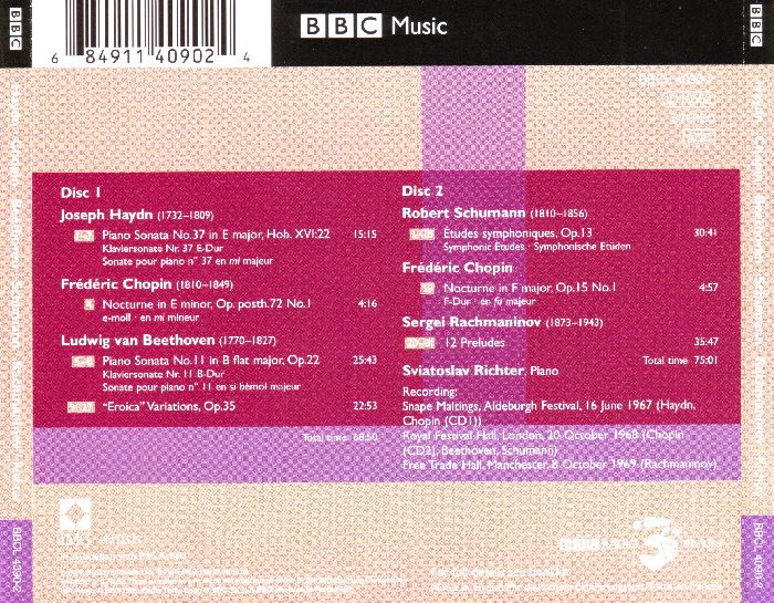 BBC Legends BBCL 4090. Richter: Haydn – Piano Sonata no.37, Chopin – Nocturne op.72 no.1, Nocturne op.15 no.1, Beethoven – Piano Sonata no.11, Eroica Variations, Schumann – Etudes Symphoniques, Rachmaninov – 12 Preludes (2 CD, APE)