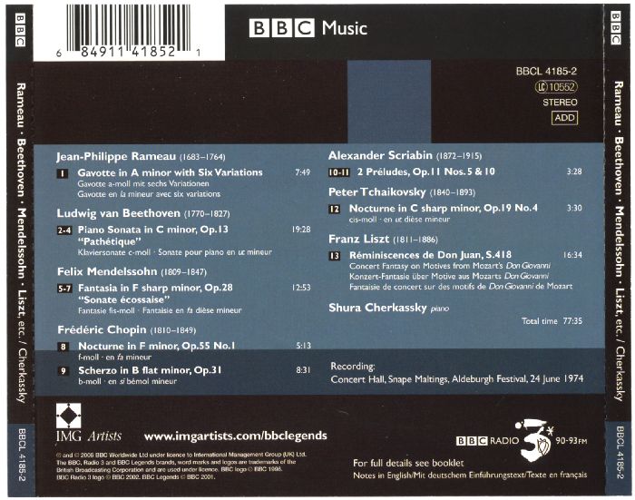 BBC Legends BBCL 4185. Cherkassky: Rameau, Beethoven, Mendelssohn, Chopin, Scriabin, Tchaikovsky, Liszt (APE)
