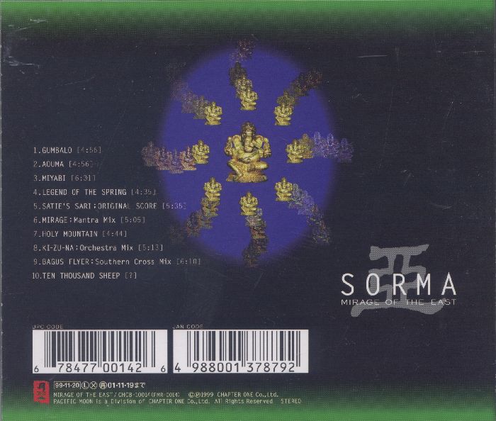 该专辑中4个女声很令人注明。她们温柔的嗓音在我们的心中产生了很强却很温暖的共鸣。轻松的旋律和节奏安排甚至给我们一种非常愉悦的感觉。可以说这种既神秘又令人兴奋的音乐正是SORMA吸引我们的所在,而这张专辑就是SORMA音乐最完美品质的体现。这张专辑会带给你展开探访SORMA迷幻的亚洲世界的旅程。