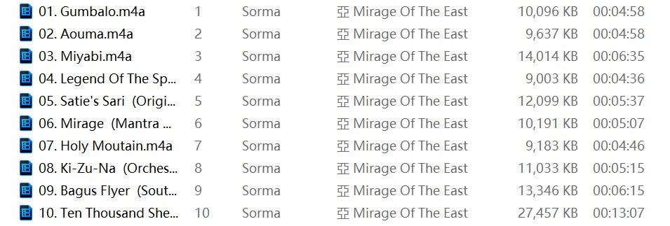 这张专辑,“东方幻影”,所包含的5首音乐都是"Illusion"专辑中音乐的混音版本。第三首,"Miyabi",原名"Echos of Life"。虽然曲调的主体是相同的,但是音乐的编排和乐器的演奏进行了完全的改变并给音乐带来了全新的形象。此外,"Satie's Sali", "Mirage", "Ki-Zu-Na", 和 "Bagus Flyer"中的人声部分以及乐曲主题保持了不变,但是其他部分却重新作了谱写。据SORMA说,你在这张专辑中听到的才是乐曲的本身,而前张专辑Illusions中的乐曲更加欢快一些。如果你喜欢这张专辑中的音乐,也许你应该和Illusions中的音乐作个有趣的对比。