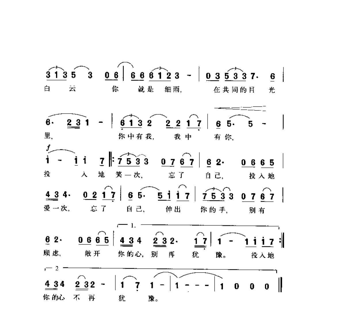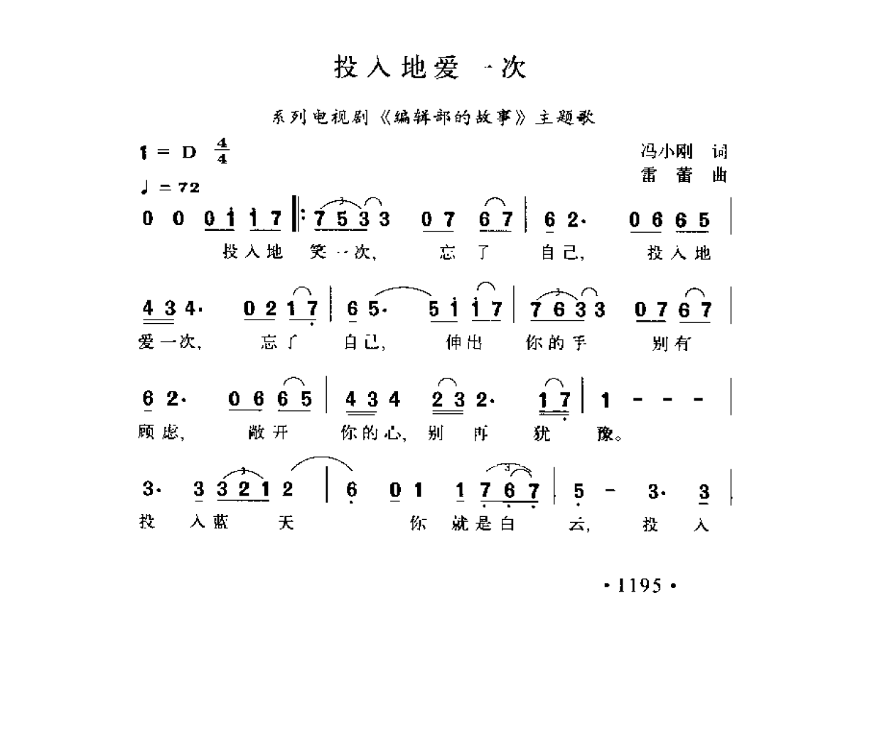 投入地爱一次(系列电视剧《编辑部的故事》主题歌)冯小刚词 雷蕾曲简谱歌词是曲谱查询网于2025年01月15日 11:29:13更新在乐谱大全频道中的内容,收录在乐谱大全栏目中;曲谱查询网分享的投入地爱一次(系列电视剧《编辑部的故事》主题歌)冯小刚词 雷蕾曲简谱五线谱高清图片,欢迎在线免费下载;曲谱查询网无需注册,即可直接下载海量歌曲谱与乐器学习相关资料。