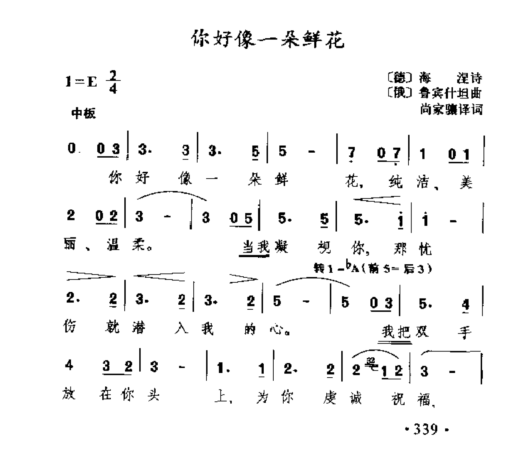 外国古典歌曲简谱:你好像一朵鲜花(俄)鲁宾什坦曲 简谱歌曲集 外国名歌1000首