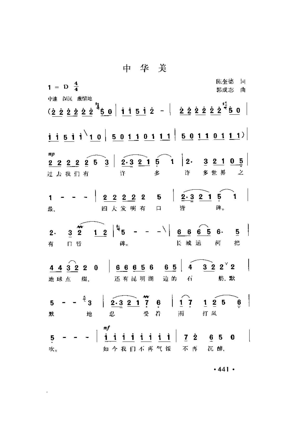 中华美 陈奎德词 郭成志曲简谱歌词是曲谱查询网于2025年01月13日 10:40:00更新在乐谱大全频道中的内容,收录在乐谱大全栏目中;曲谱查询网分享的中华美 陈奎德词 郭成志曲简谱五线谱高清图片,欢迎在线免费下载;曲谱查询网无需注册,即可直接下载海量歌曲谱与乐器学习相关资料。