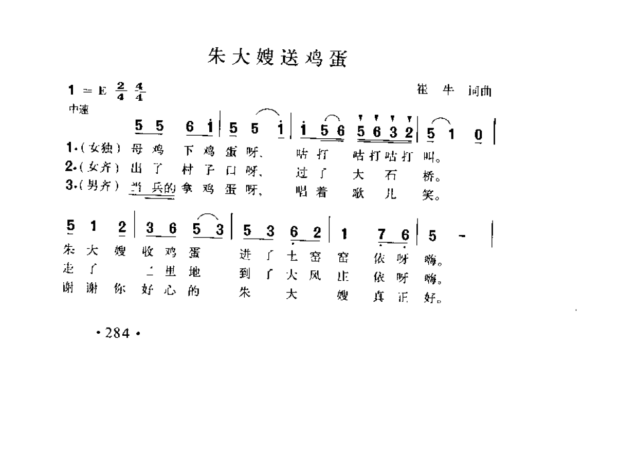 朱大嫂送鸡蛋 崔牛词曲简谱歌词是曲谱查询网于2025年01月12日 14:20:31更新在乐谱大全频道中的内容,收录在乐谱大全栏目中;曲谱查询网分享的朱大嫂送鸡蛋 崔牛词曲简谱五线谱高清图片,欢迎在线免费下载;曲谱查询网无需注册,即可直接下载海量歌曲谱与乐器学习相关资料。