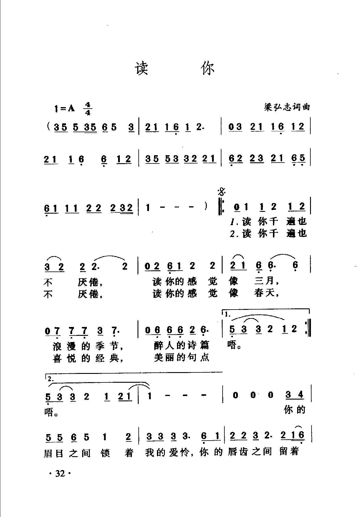 中国名歌500首乐谱:读你 梁弘志词曲