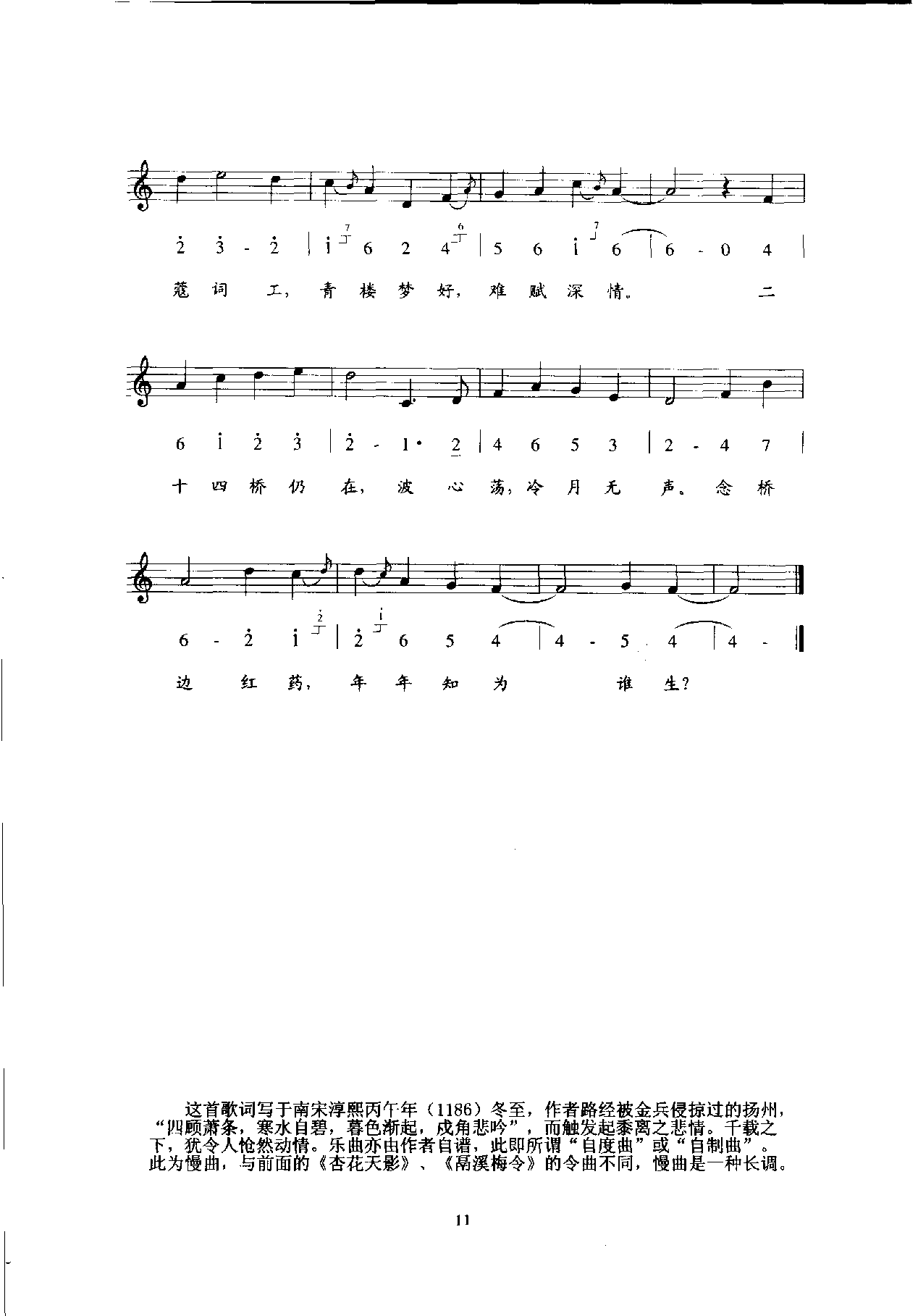 这首歌词写于南宋淳熙丙个年(1186)冬至,作者路经被金兵侵掠过的扬州,“四顾萧条,寒水自碧,暮色渐起,成角悲吟”而触发起黍离之悲情。千载之犹令人怆然动情。乐曲亦由作者自谱,此即所谓“自度曲”或“自制曲”此为慢曲,与前面的《杏花天影》、《鬲溪梅令》的令曲不同,慢曲是一种长调。