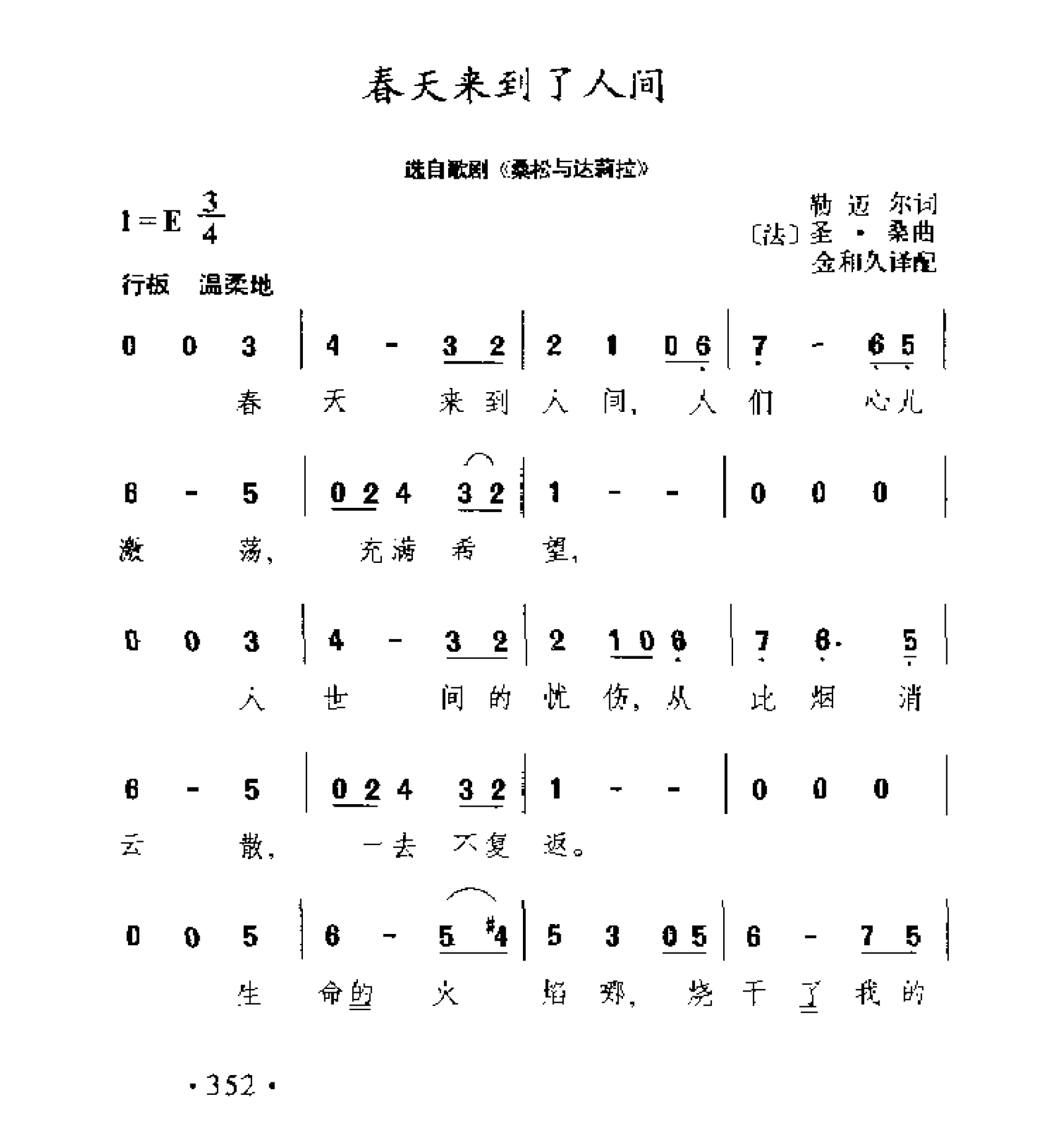外国古典歌曲简谱:春天来到了人间 选自歌剧《桑松与达莉拉》(法)圣·桑曲