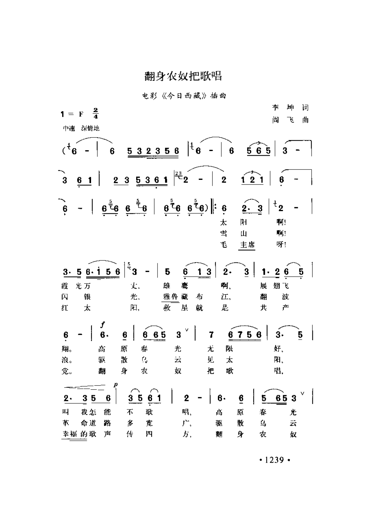翻身农奴把歌唱(电影《今日西藏》插曲)李坤词 阎飞曲
