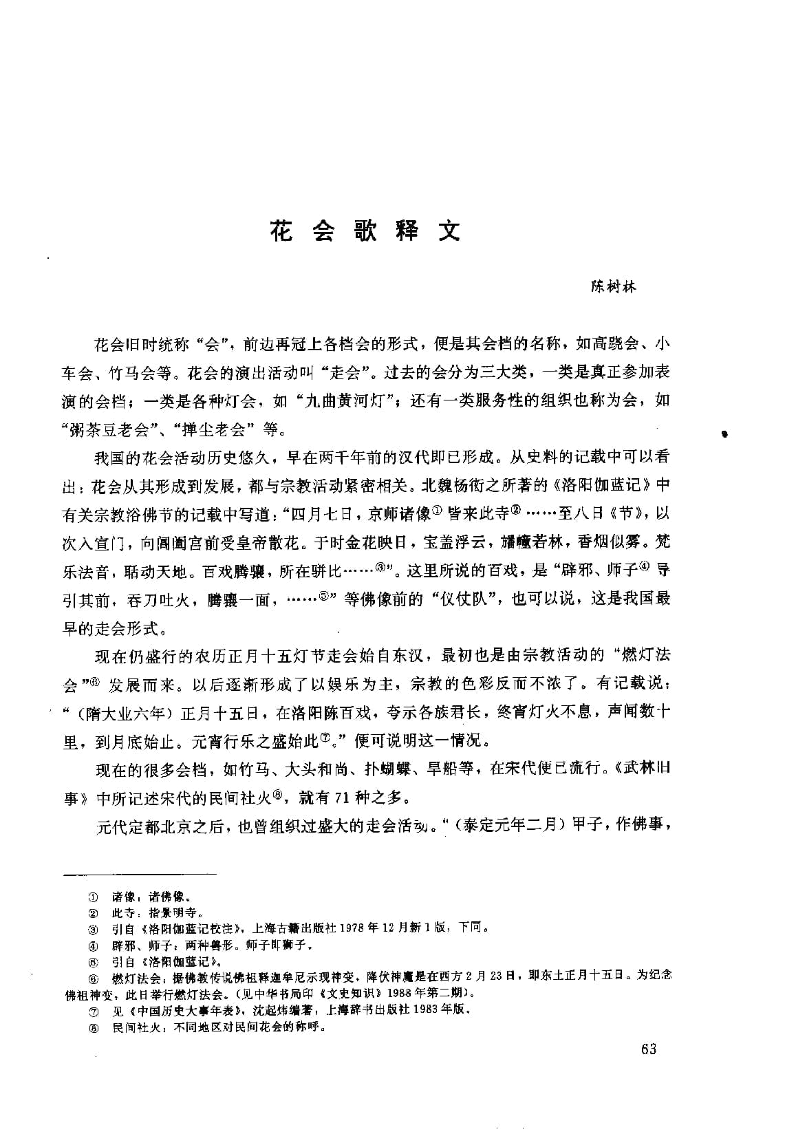 我国的花会活动历史悠久,早在两千年前的汉代即已形成。从史料的记载中可以看出:花会从其形成到发展,都与宗教活动紧密相关。北魏杨之所著的《洛阳伽蓝记》中有关宗教浴佛节的记载中写道:“四月七日,京师诸像①皆来此寺③至八日节》,以次入宣门,向阁阖宫前受皇帝散花。于时金花映日,宝盖浮云,幢若林,香烟似雾。梵乐法音,动天地。百戏腾骤,所在比.③”。这里所说的百戏,是“辟邪、师子@导引其前,吞刀吐火,腾骤一面,……”等佛像前的“仪仗队”,也可以说,这是我国最早的走会形式。